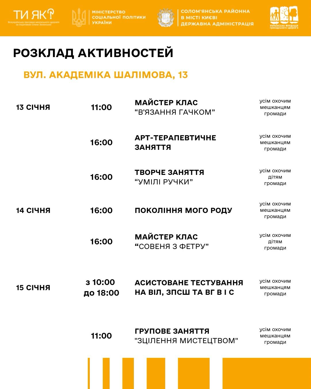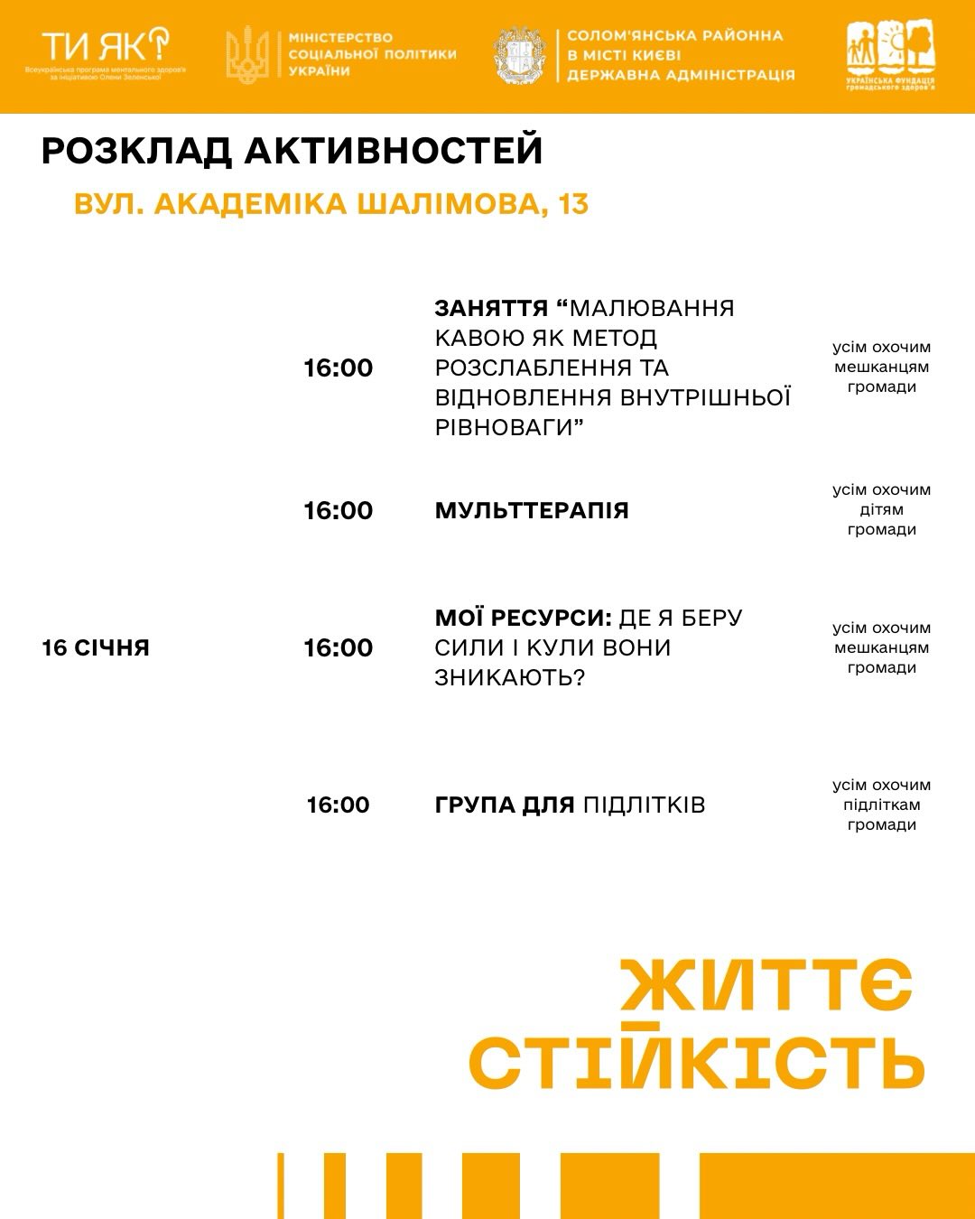 🥰 Центр Життєстійкості Солом’янського району м. Київ поруч. Ділимося графіком наших зустрічей. Обирайте свій час і приходьте.