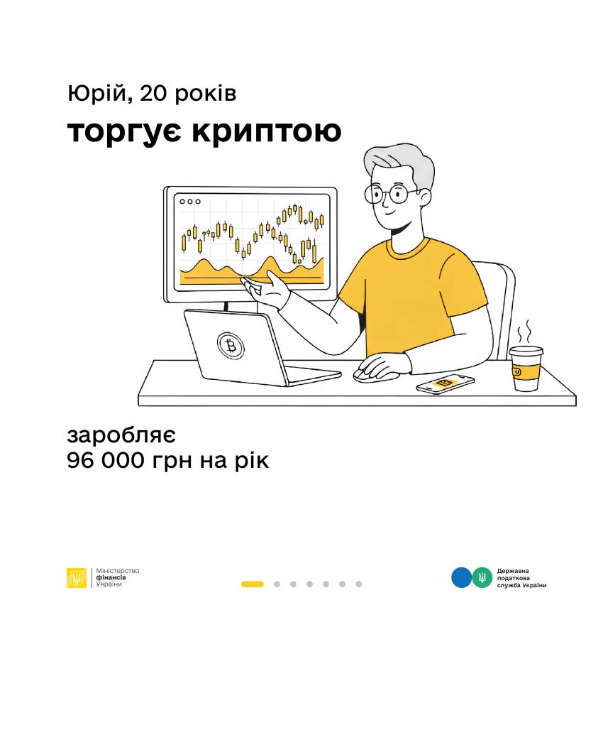 Двадцятирічний Юрій заробляє на операціях із криптовалютою. Які податки він сплачує? Куди саме надходять його кошти? На що держава та громади їх використовують і хто втрачає, якщо податки не сплачені?