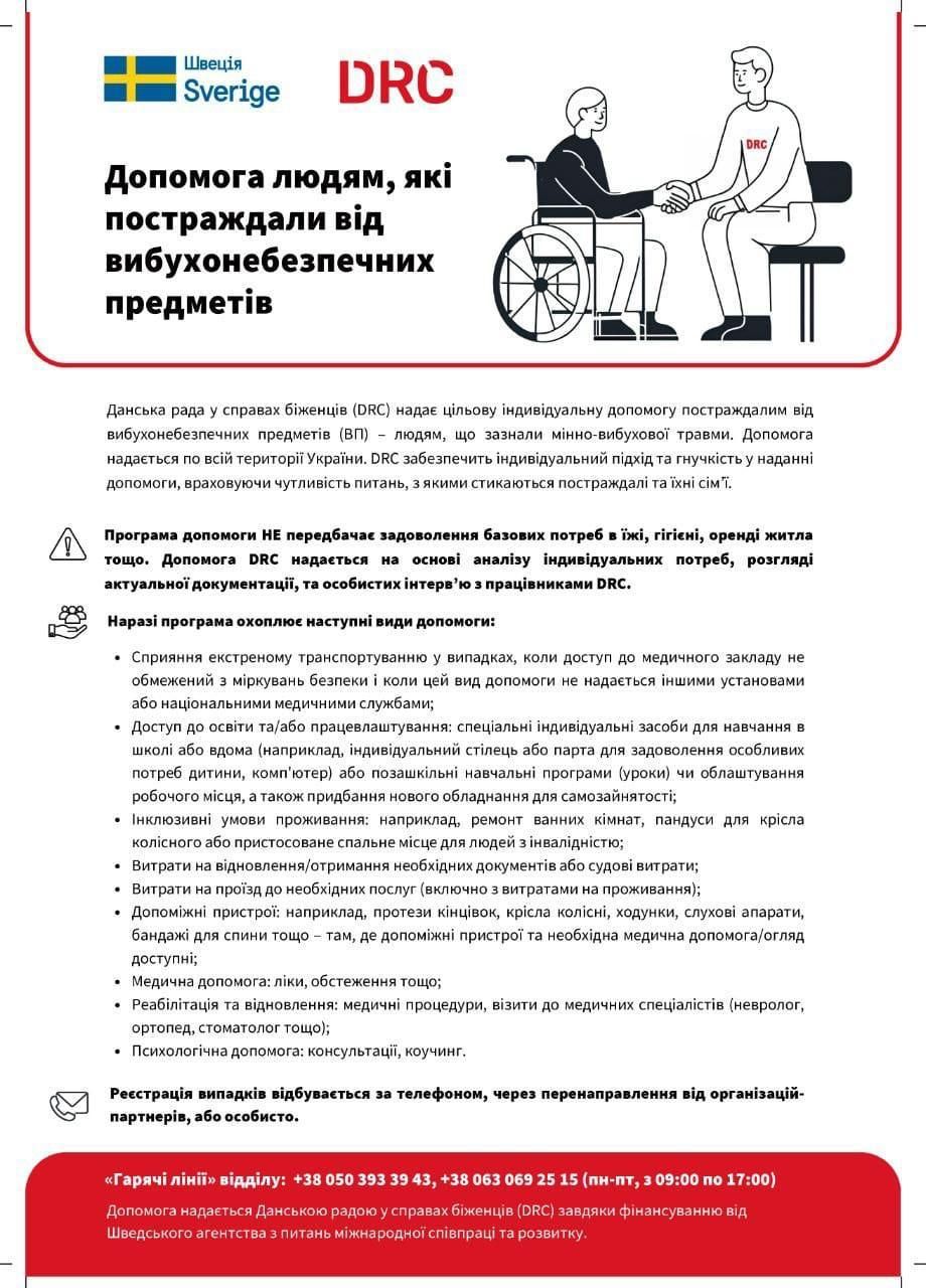 Інформуємо, що у наших Партнерів — Данської Ради у справах біженців (DRC) діє програма індивідуальної допомоги для осіб, які зазнали мінно-вибухових травм, у тому числі травм внаслідок обстрілів.