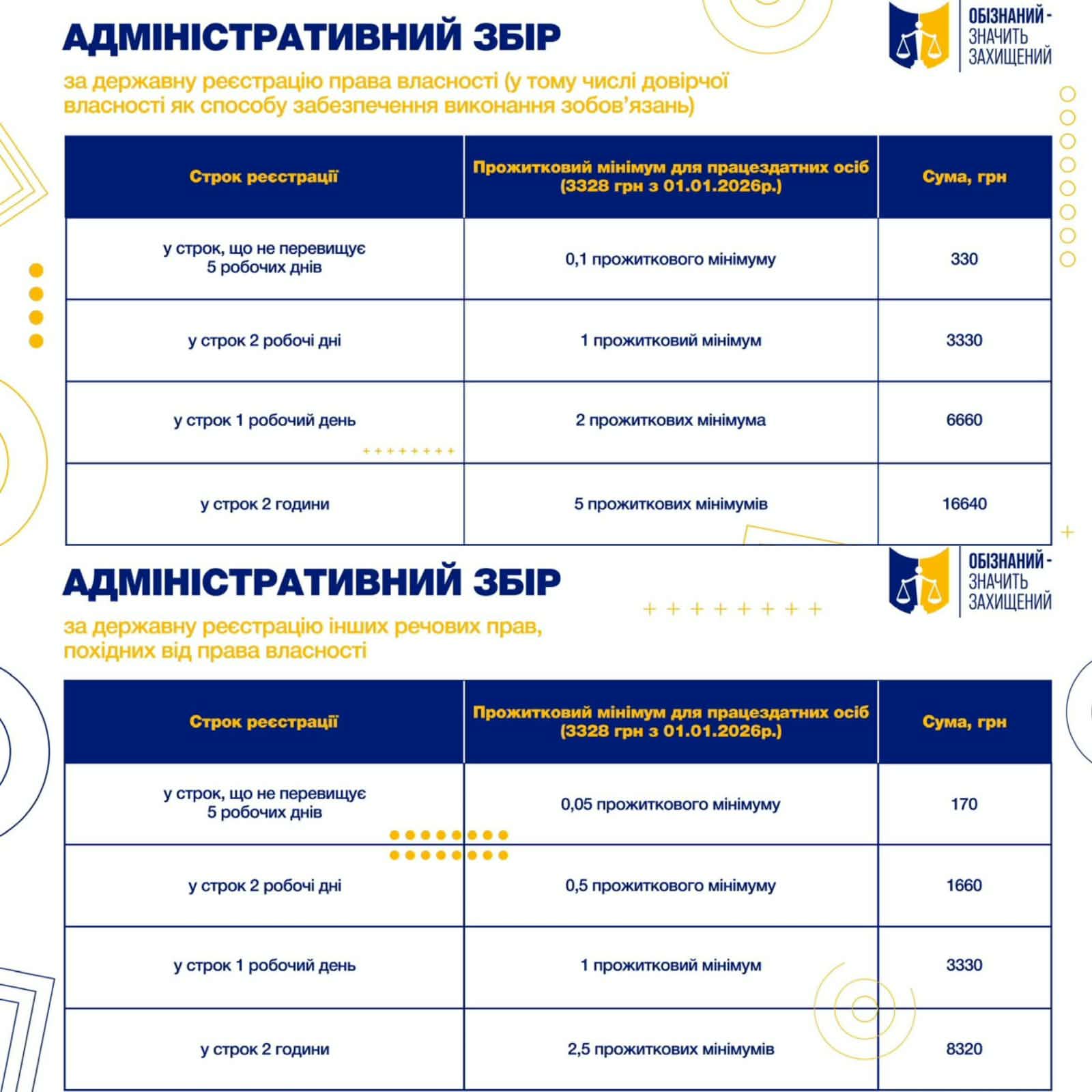 ✅адміністративний збір справляється у відповідному розмірі від прожиткового мінімуму для працездатних осіб, встановленого законом на 1 січня календарного року, в якому подаються відповідні документи для проведення державної реєстрації прав, та округлюється до найближчих 10 гривень;