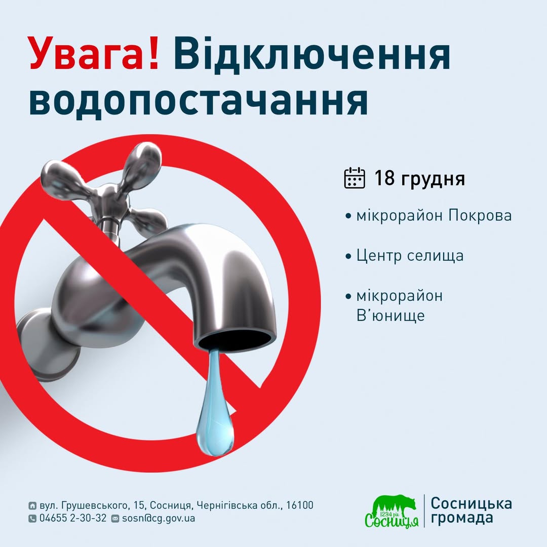 Сьогодні, 18 грудня, у зв’язку з виконанням аварійно-відновлювальних робіт на водогоні буде тимчасово припинено водопостачання частини мікрорайону Покрова.