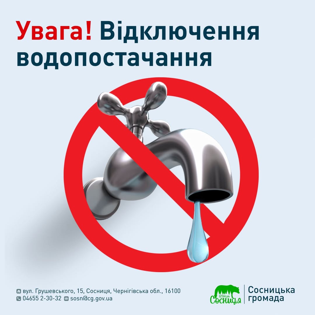 У зв’язку з аварією на водогоні в Сосниці орієнтовно з 20:30 тимчасово буде припинено водопостачання.