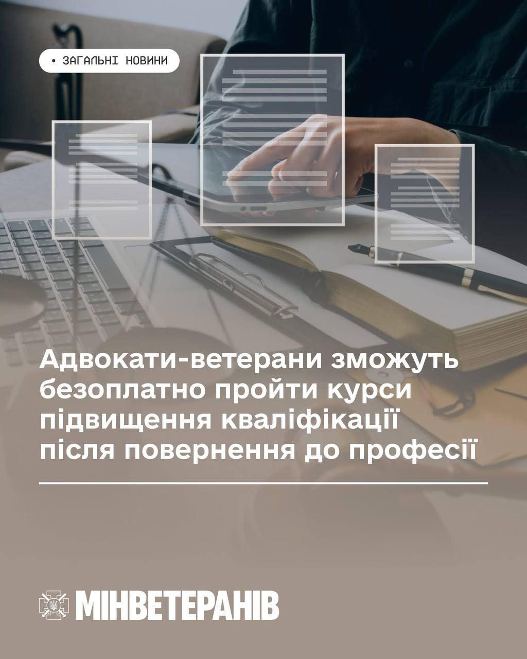 ⚖️ Адвокати з числа ветеранів зможуть безоплатно проходити курси підвищення кваліфікації після повернення до професійної діяльності.