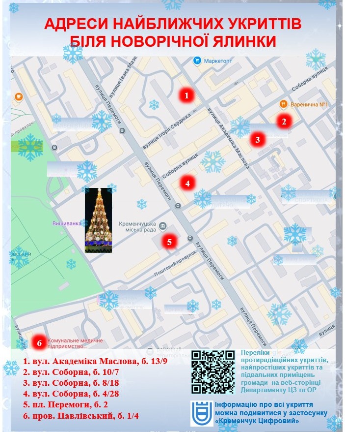 🎄 Адреси найближчих укриттів біля новорічної ялинки.