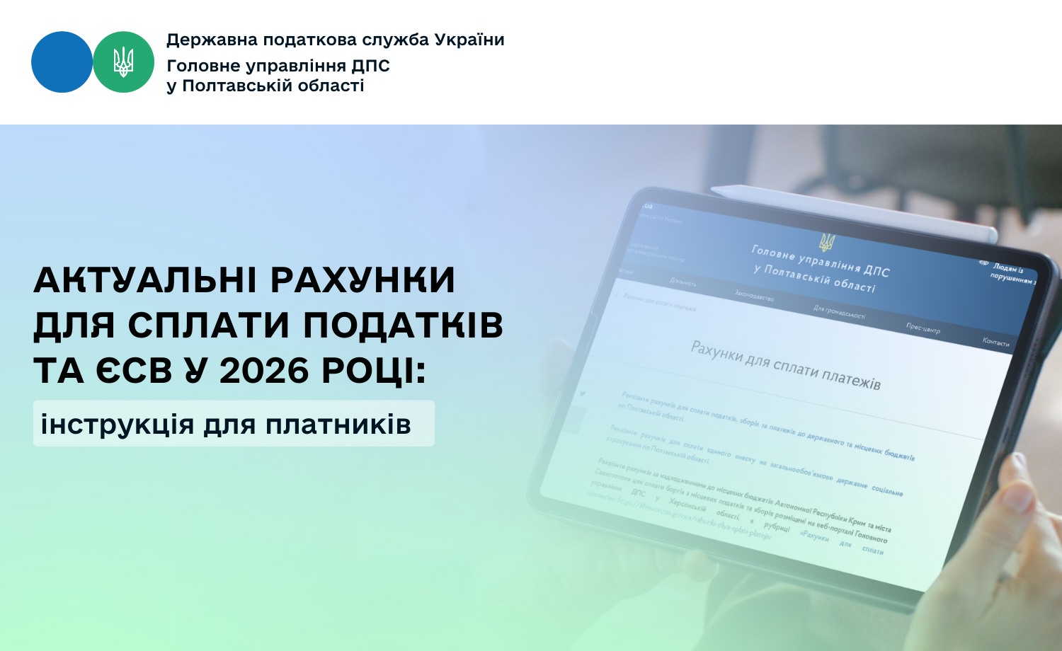 Головне управління ДПС у Полтавській області повідомляє, що реквізити рахунків для податкових платежів та єдиного внеску на 2026 рік опубліковано на вебпорталі ДПС.