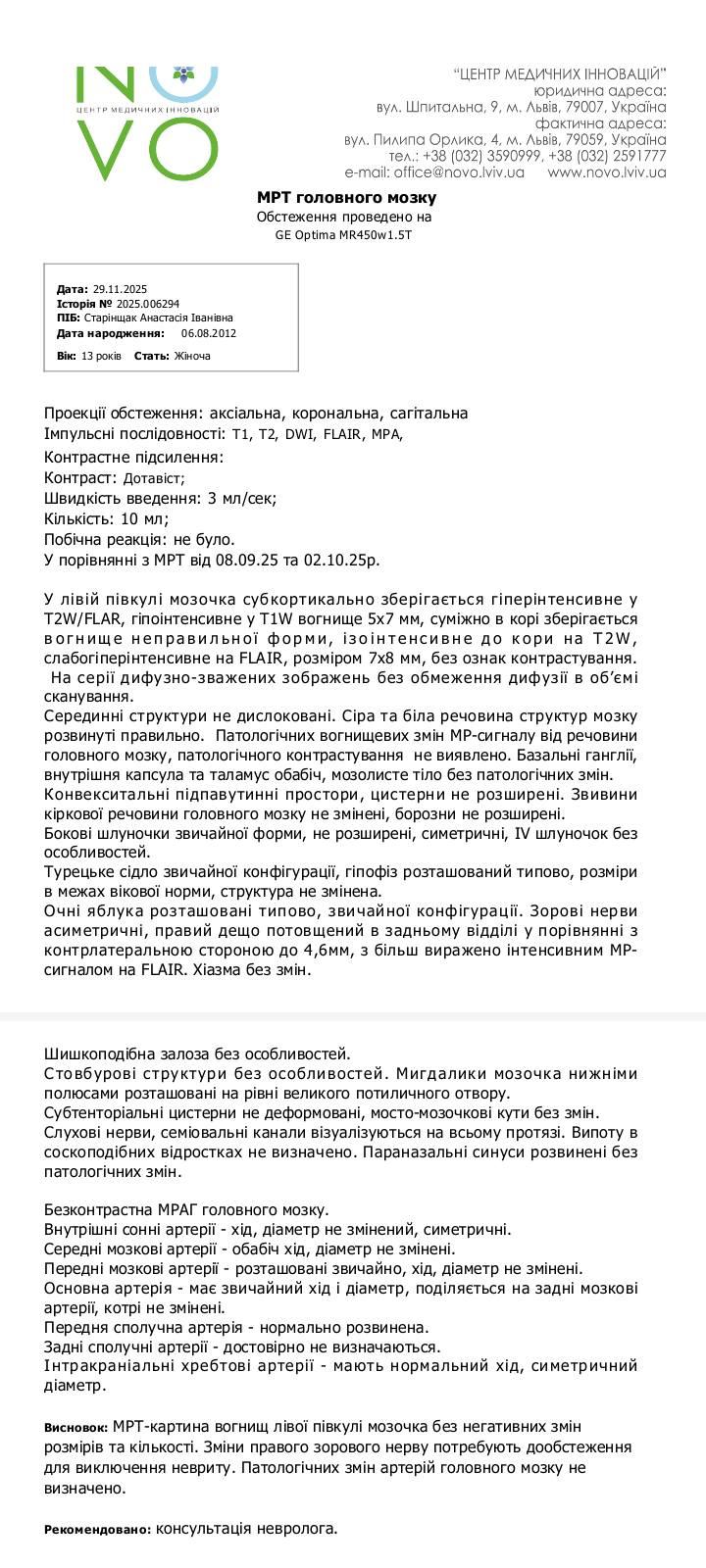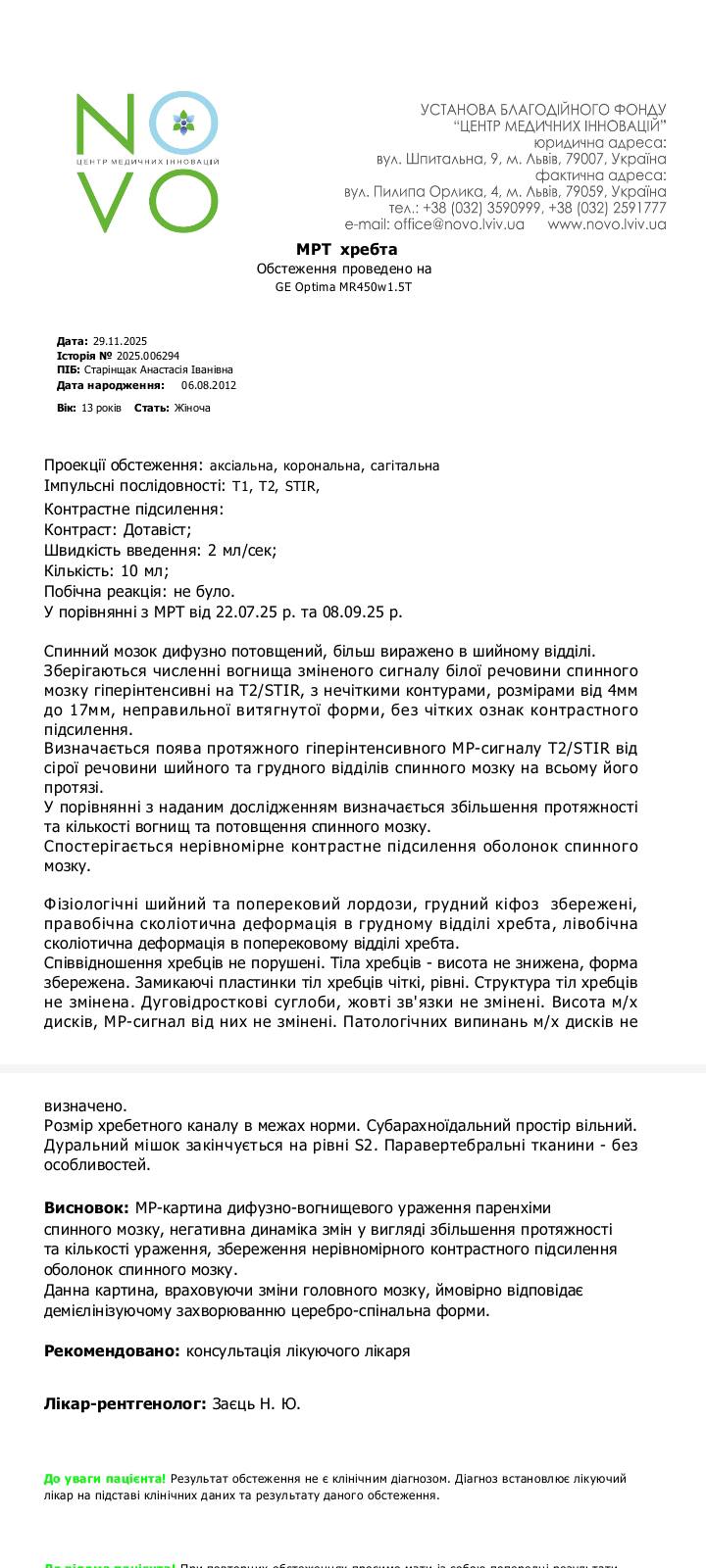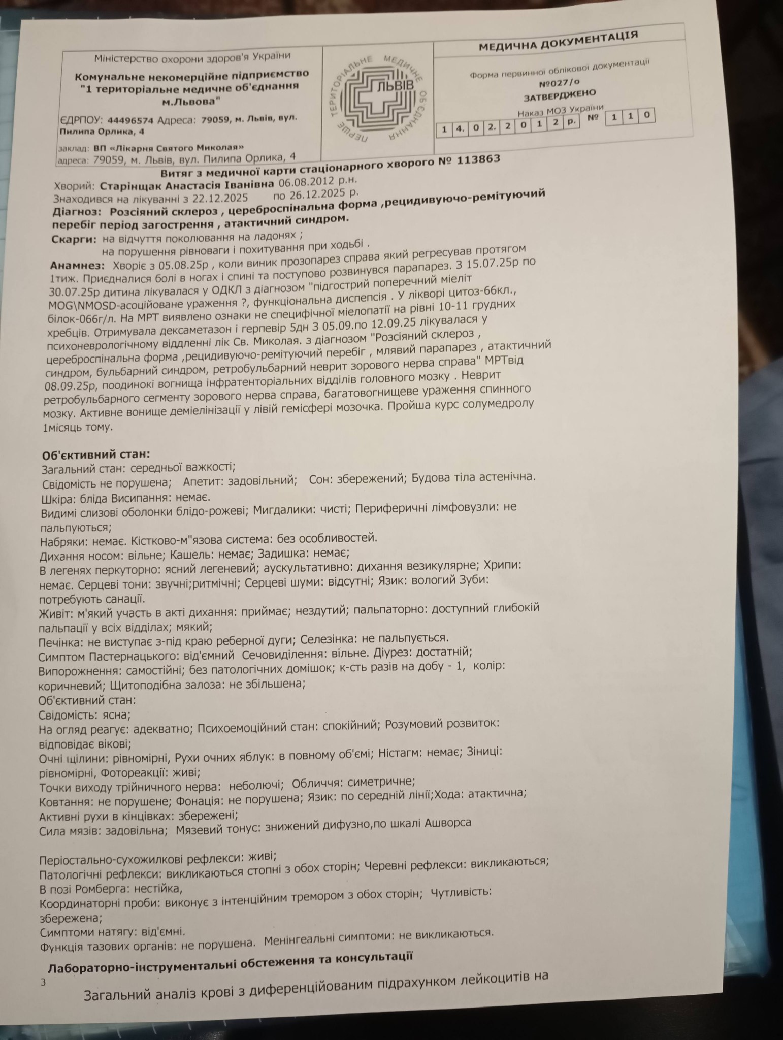 Анастасія-щира світла дівчинка,яка мріє жити без болю. Вона народилась здоровою дівчинкою. Життя Насті перевернулось, коли їй майже виповнилось 13 років. Дівчина почала відчувати сильний біль у хребті, і після чого у неї почали терпнути і боліти ноги і руки. Біль є так що вона не може ні ходити ні нічого взяти у руки. У лікарні де вона вже перебуває 6 місяців поставили діагноз” Розсіяний склероз”. Для сім’ї це було як грім серед ясного неба. За цей час що Настя перебуває у лікарні, вона пройшла нелегкий шлях, кожного разу аналізи, МРТ яке проходить кожного місяця, функція з кісткового мозку,також ліки і капальниці (гормональні -солумедрол) на даний час всі заощадження вже витрачені . Я мама Марія звертаюсь до усіх не байдужих у допомозі на лікування Насті. На даний час солумедрол вже їй не допомагає. Лікар назначив препарат, який коштує не малі кошти (Біовен10% 100мл.) Його потрібно придбати до кінця січня. Одна упаковка того препарату коштує майже 30000,а його потрібноїй 750мл 7 шт по 100мл і один 50мл.А це виходить не мала сума. Я як мама сама невзмозі його придбати тому прошу у Вас допомоги. Я щиро вдячна односельчанам і однокласникам які допомогли мені і підтримали Настю у вересні. Але на жаль ці кошти вже витрачено на лікування. Я щиро дякую хто відгукнеться на моє горе і допоможе Насті адже разом ми сила. Поширення вітається .https://send.monobank.ua/jar/4kHjoMA3h7