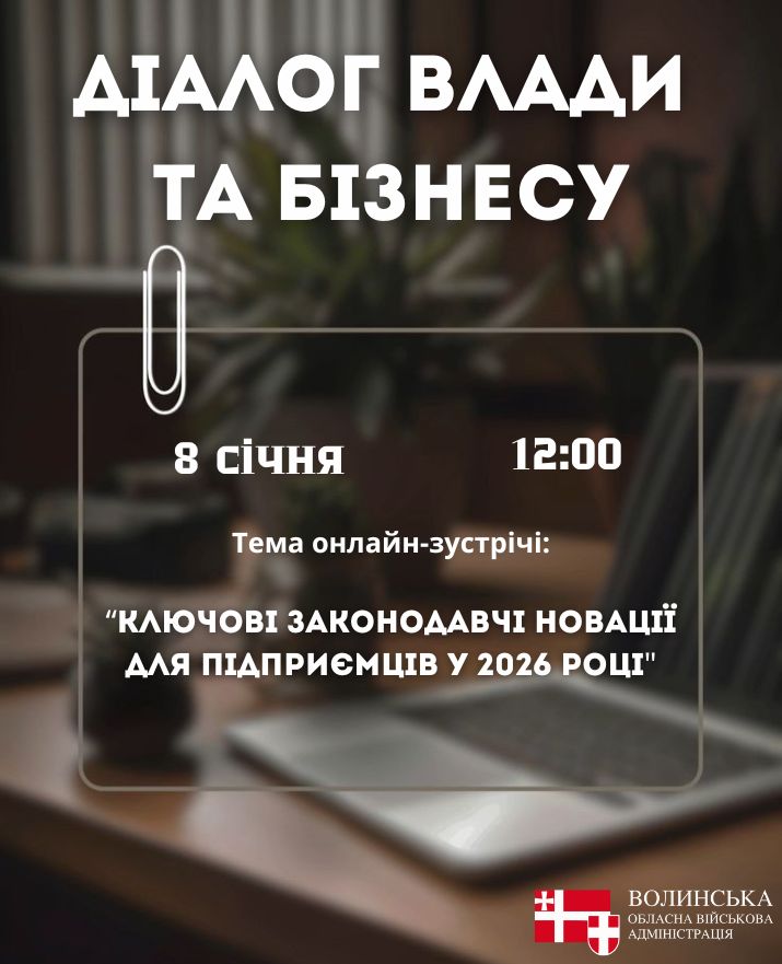 ✅У четвер, 8 січня, о 12:00 відбудеться онлайн-зустріч влади та бізнесу на тему : «Ключові законодавчі новації для підприємців у 2026 році».