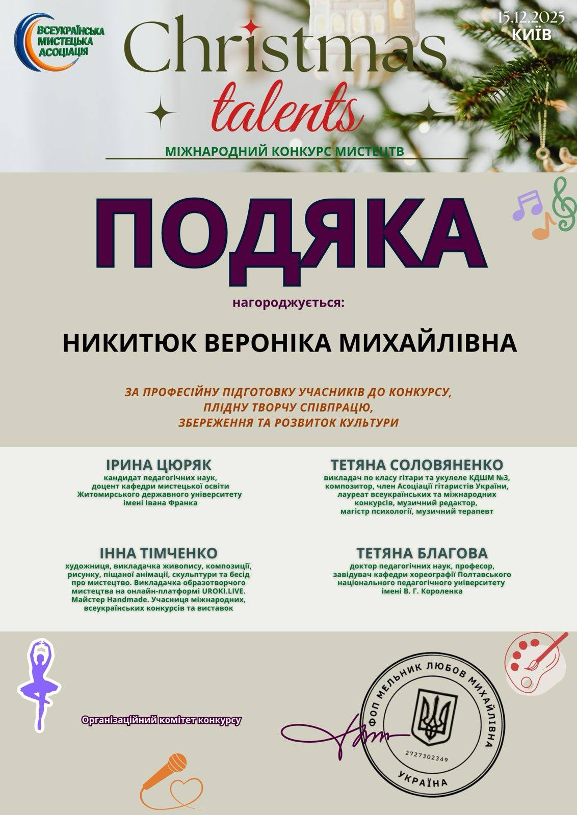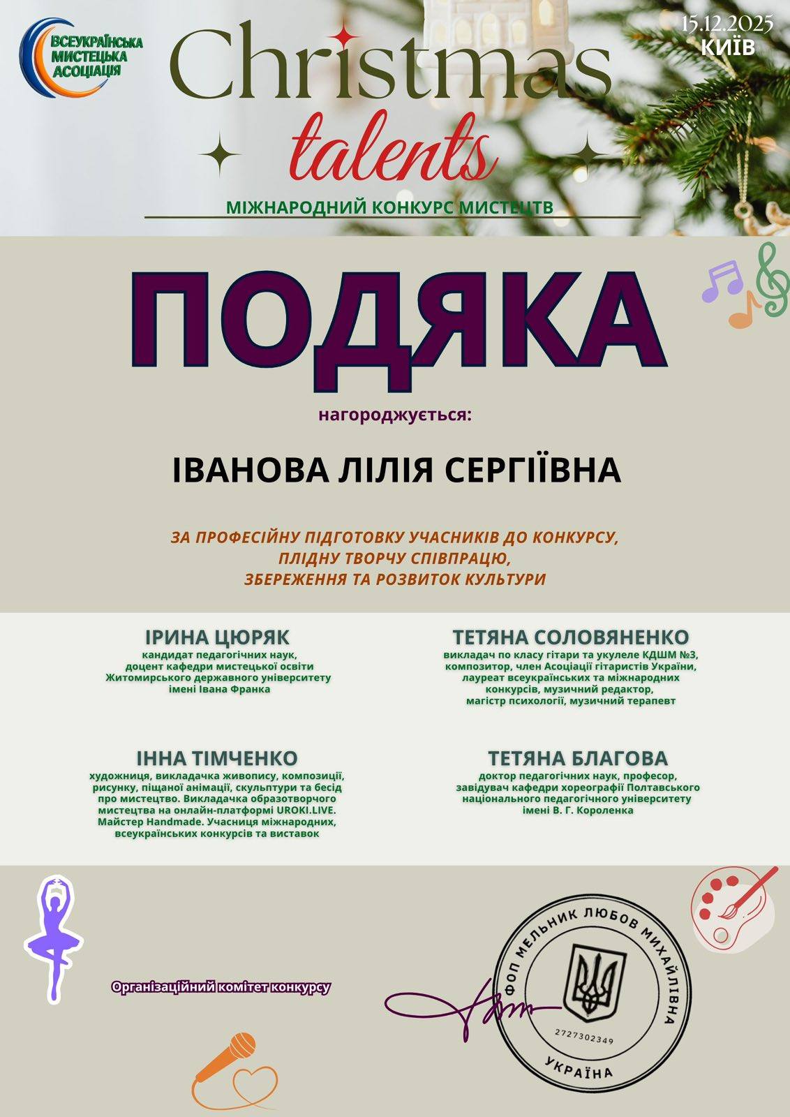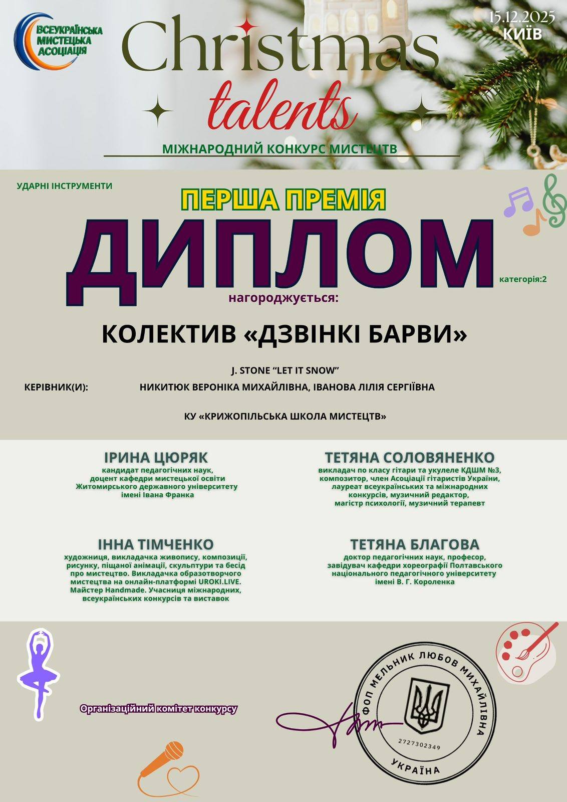 🏆 Ансамбль «Дзвінкі барви» виборов І місце на Міжнародному конкурсі мистецтв Christmas Talents! 🥇🥇🥇