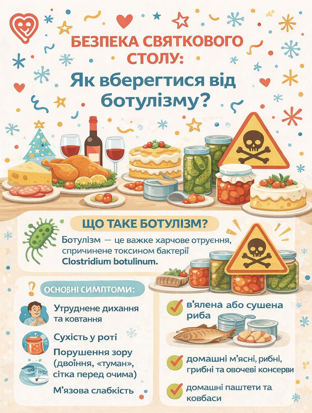 Наближаються Різдвяні та Новорічні і свята. Не дивлячись на складну ситуацію в Україні та нашій області, кожна родина буде готуватися до свят, проводити запаси продуктів харчування для виготовлення святкових страв, салатів тощо. Тому на передодні не буде зайвим нагадати про небезпеку яка може таїтися в продуктах домашнього консервування ( м’ясних, рибних, овочевих), рибі та морепродуктах , рослинній та тваринній продукції.