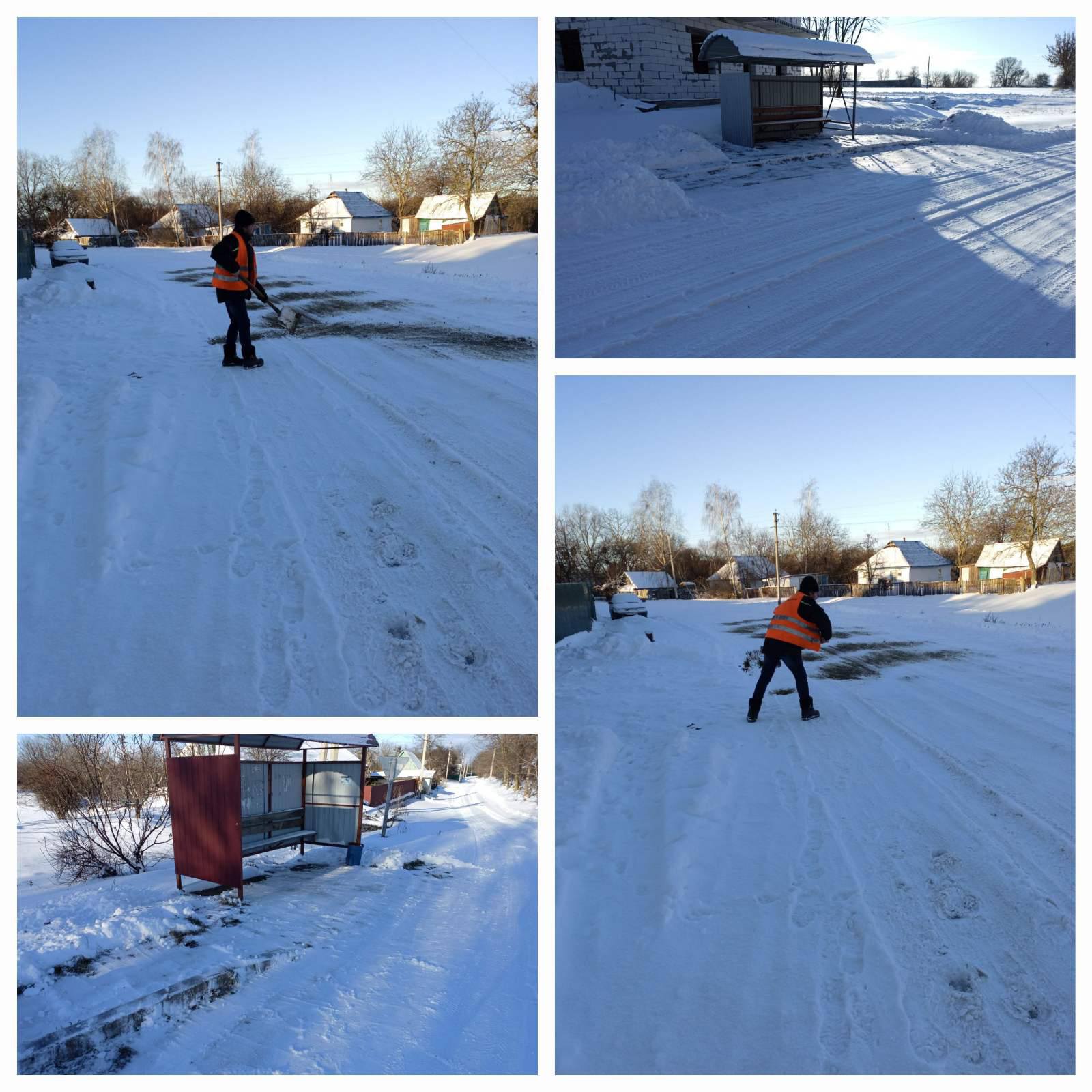 -прибирання снігу на зупинках громадського транспорту по вулиці Пироженка с. Грушів;