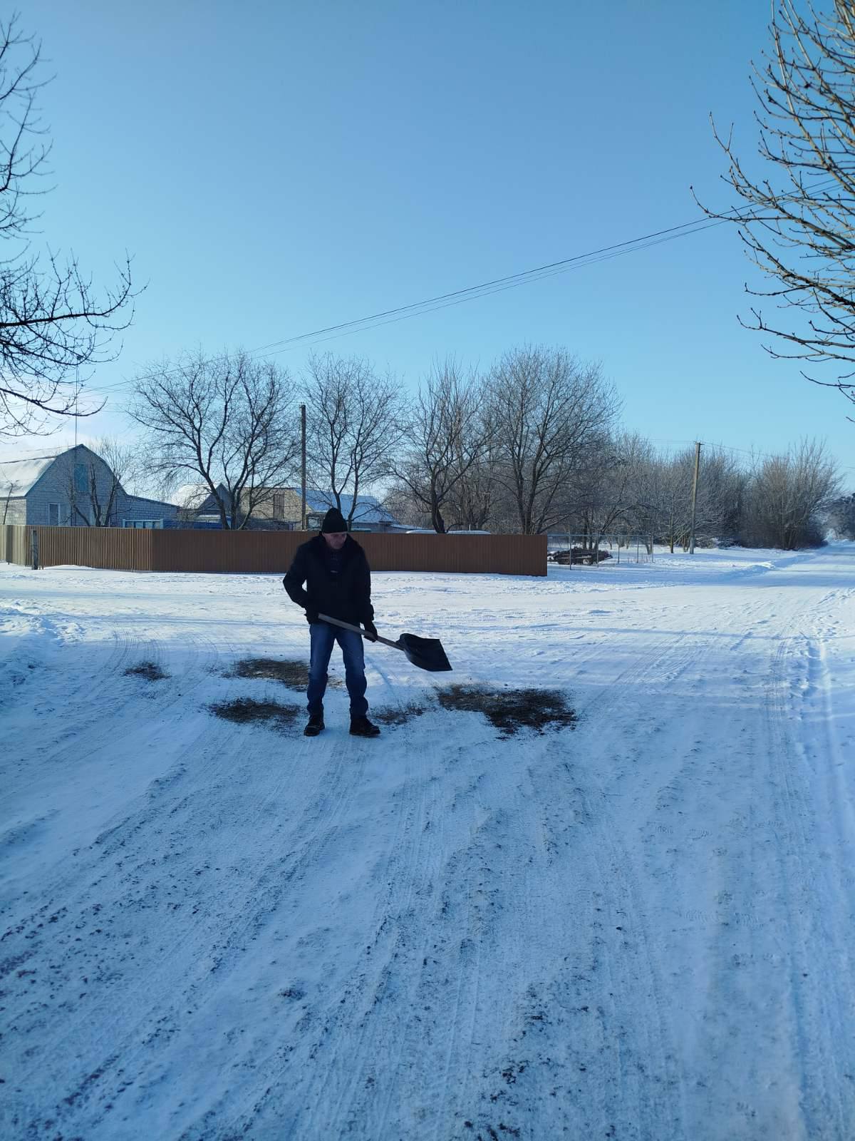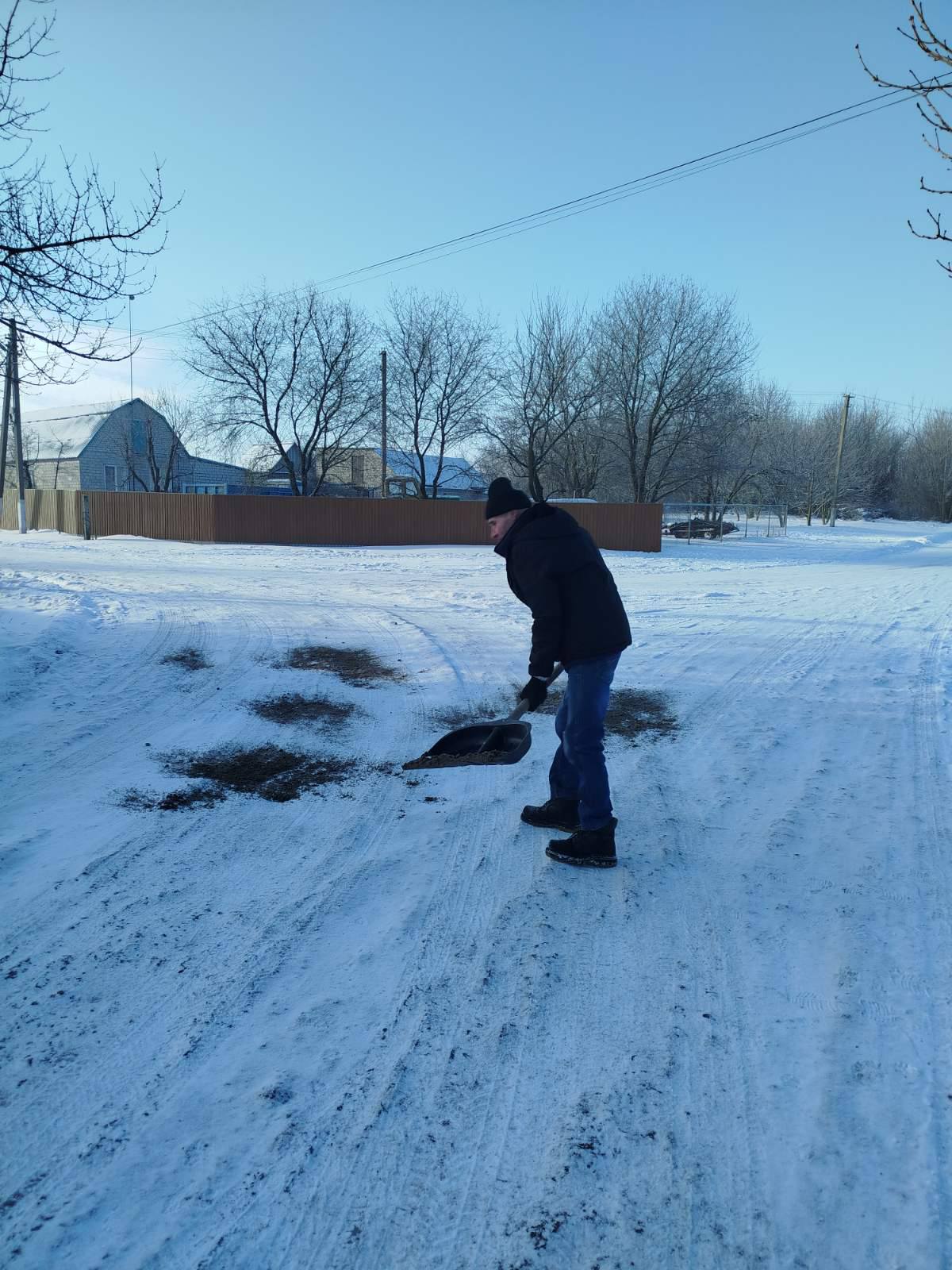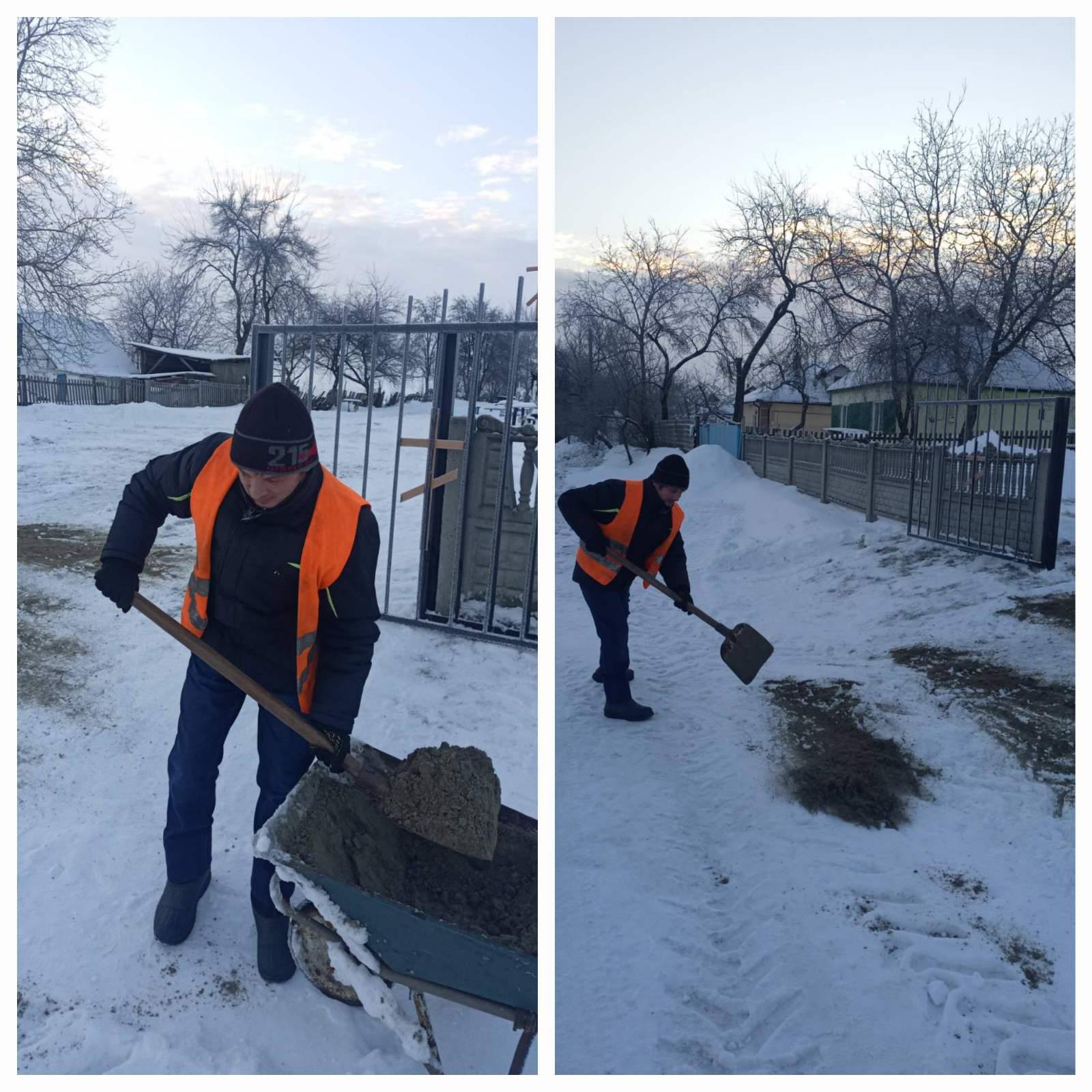 -розчистка снігу на територіях та просипка протиожеледною сумішшю кладовищ с. Грушів та с. Малий Букрин.