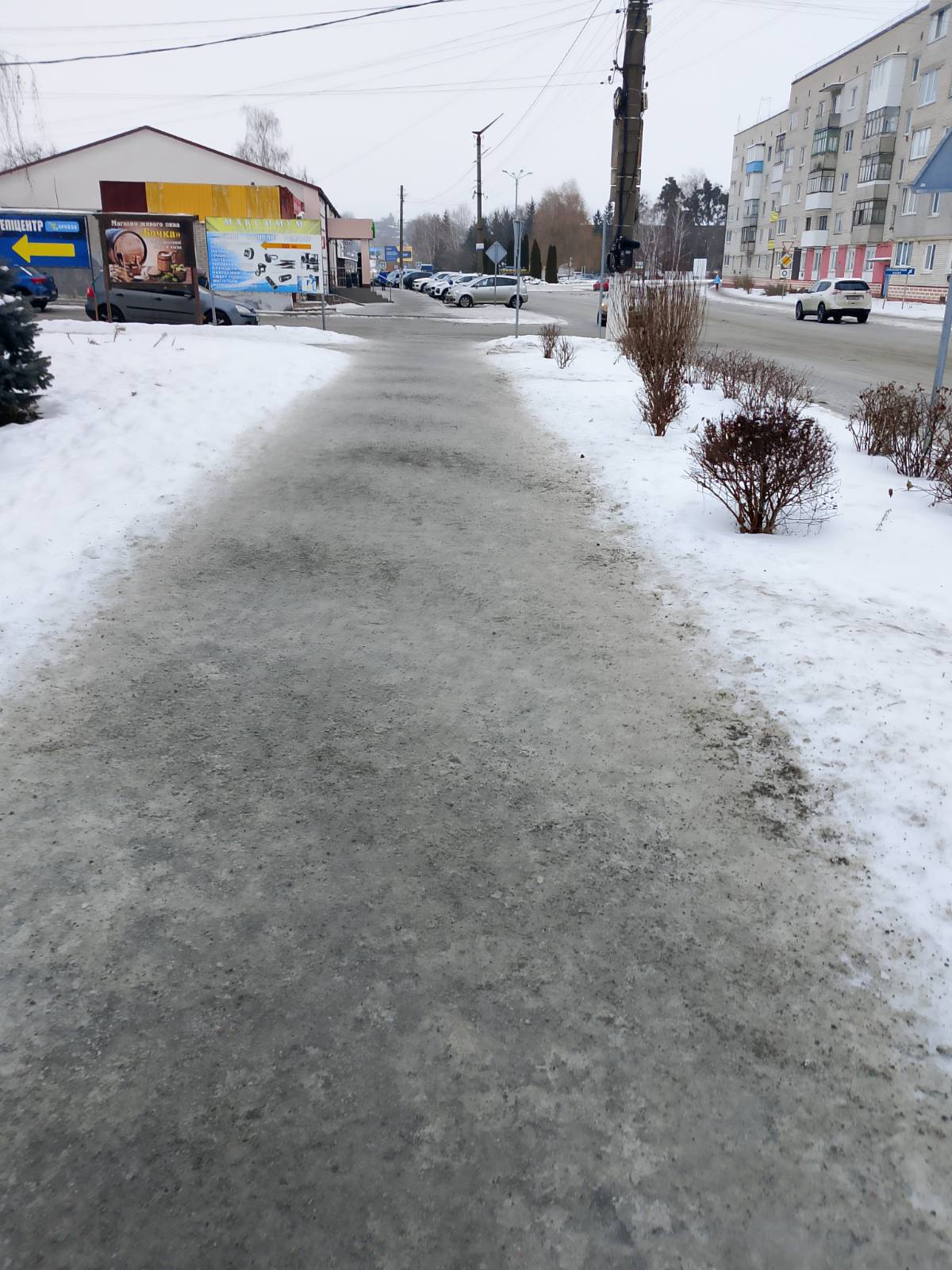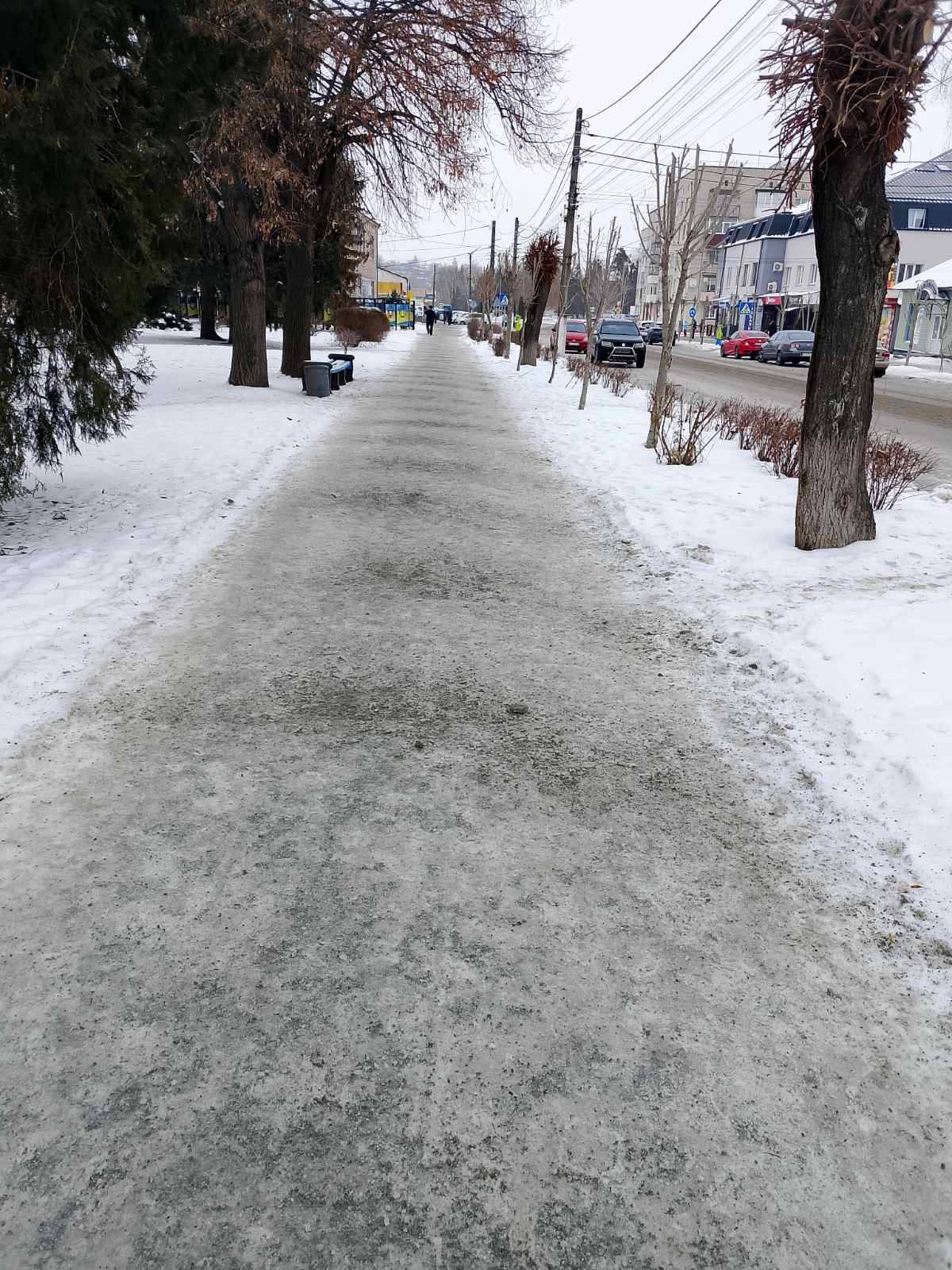 -протиожеледною сумішшю просипано тротуари по вулиці Соборна та Шевченка;