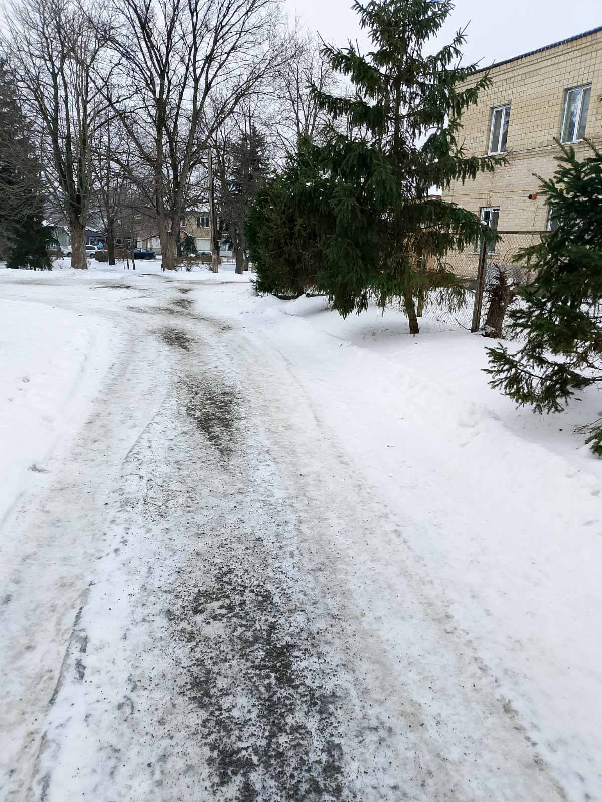 -протиожеледною сумішшю просипано зупинки громадського транспорту;