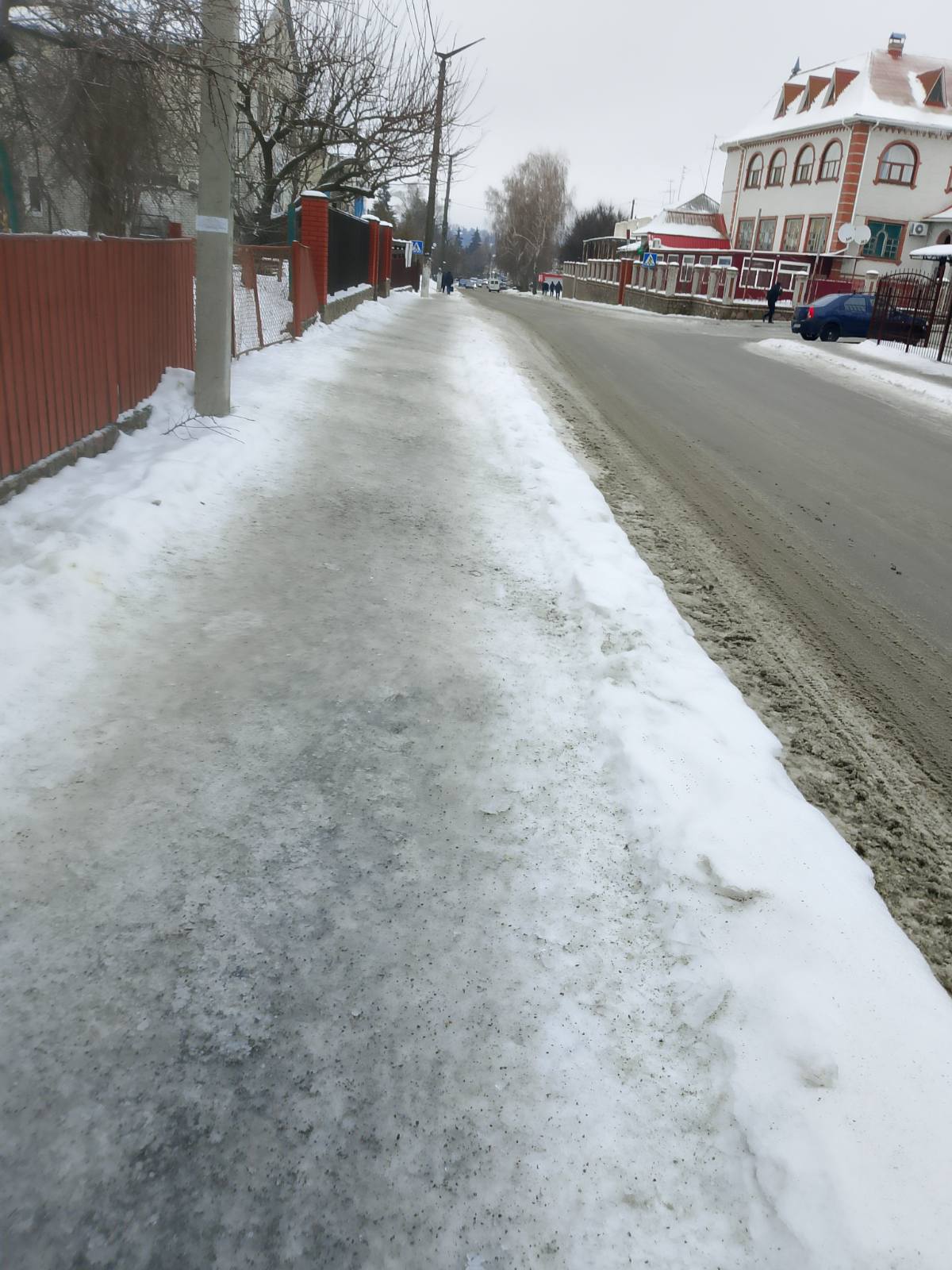 -протиожеледною сумішшю просипано тротуари по вулиці Соборна, Київський Шлях, Шевченка.