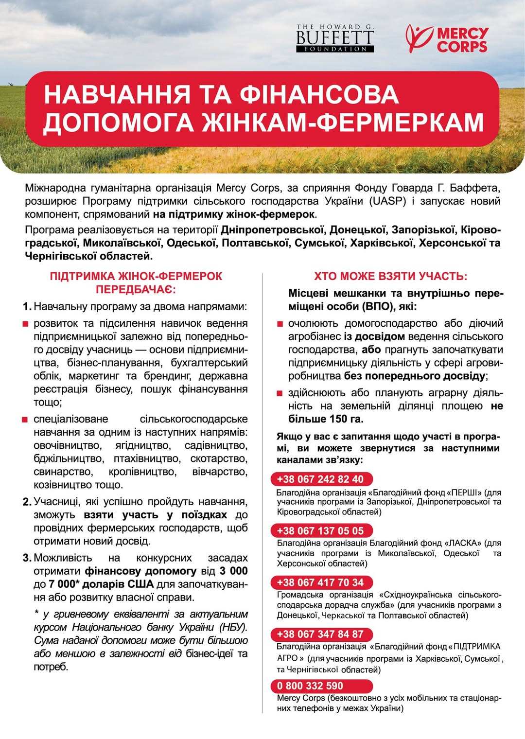 БО “БФ “ПЕРШІ” реалізуємо Програму підтримки сільського господарства України UASP міжнародної гуманітарної організації Mercy Corps за сприяння Фонду Говарда Г. Баффета продовжує прийом заявок компоненту, спрямованого на підтримку жінок-фермерок.