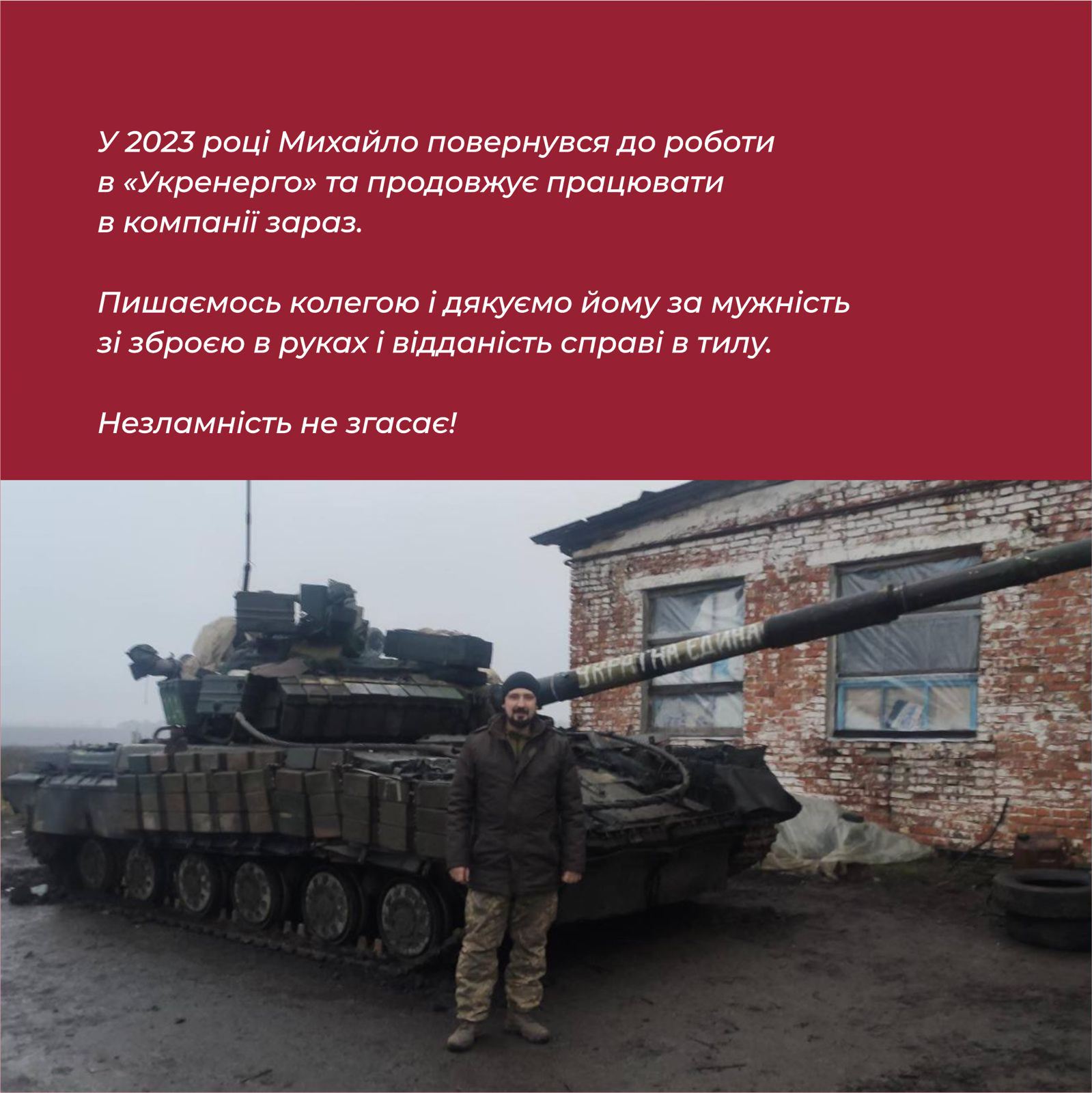 У 2023 році Михайло повернувся до роботи в «Укренерго» та продовжує працювати в компанії зараз.. Пишаємось колегою і дякуємо йому за мужність зі зброєю в руках і відданість справі в тилу. Незламність не згасає!