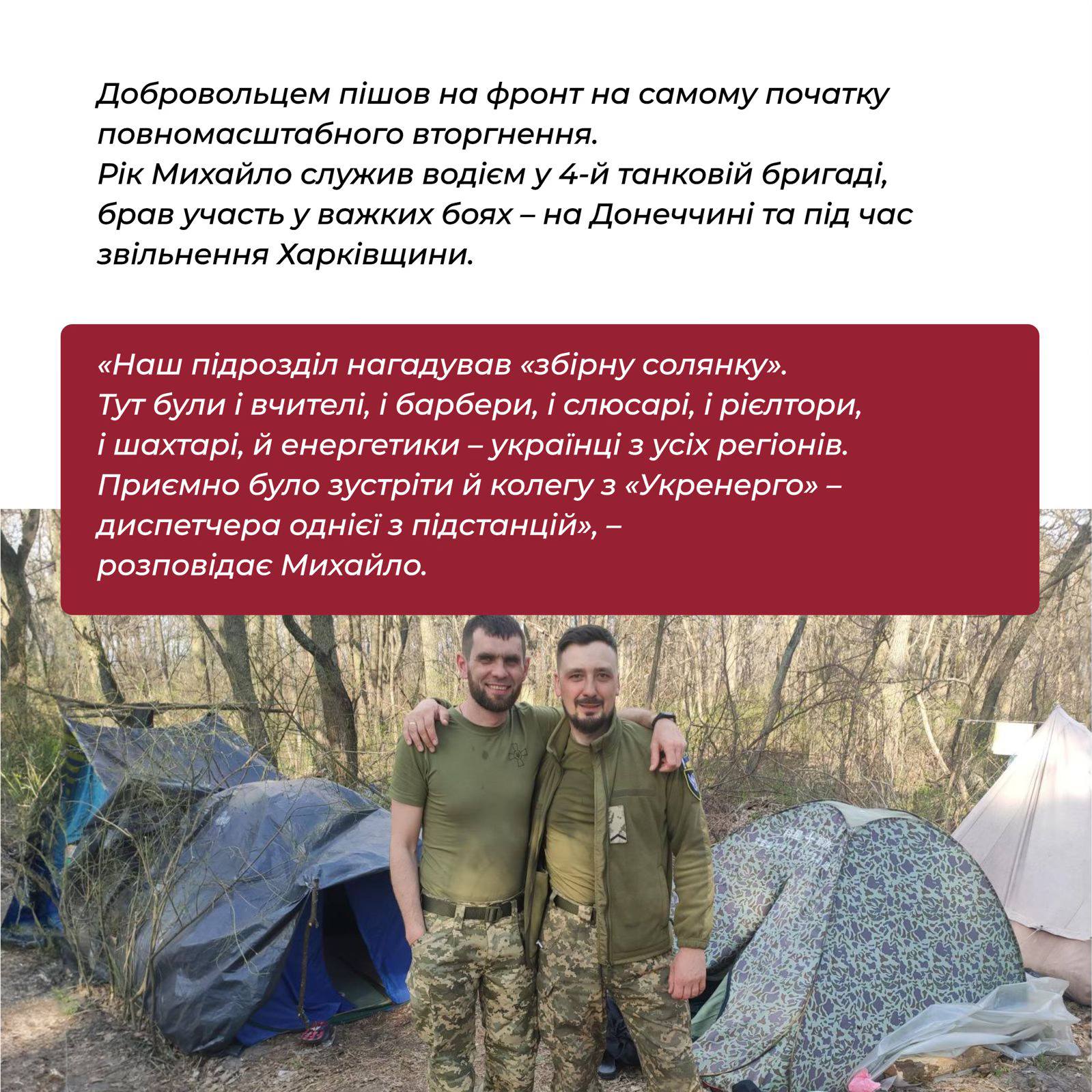 💬«Наш підрозділ нагадував «збірну солянку». Тут були і вчителі, і барбери, і слюсарі, і рієлтори, і шахтарі, й енергетики – українці з усіх регіонів. Приємно було зустріти й колегу з «Укренерго» – диспетчера однієї з підстанцій», – розповідає Михайло.