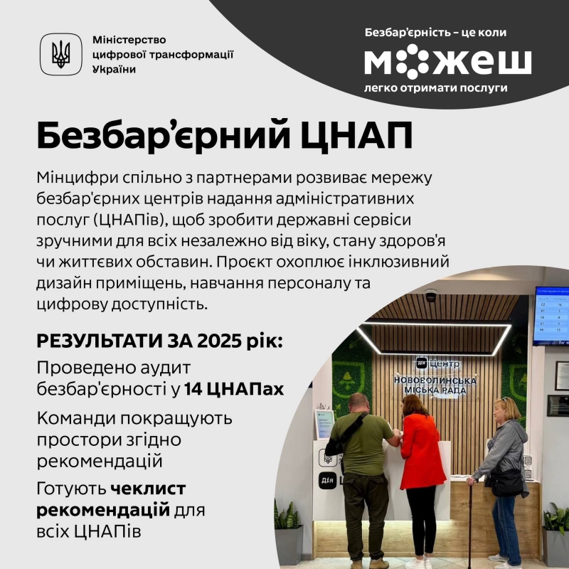📍 Цифрову безбар’єрність розвиває проєкт «Безбар’єрний ЦНАП» (Мінцифри) – вони вже є в 14 громадах.