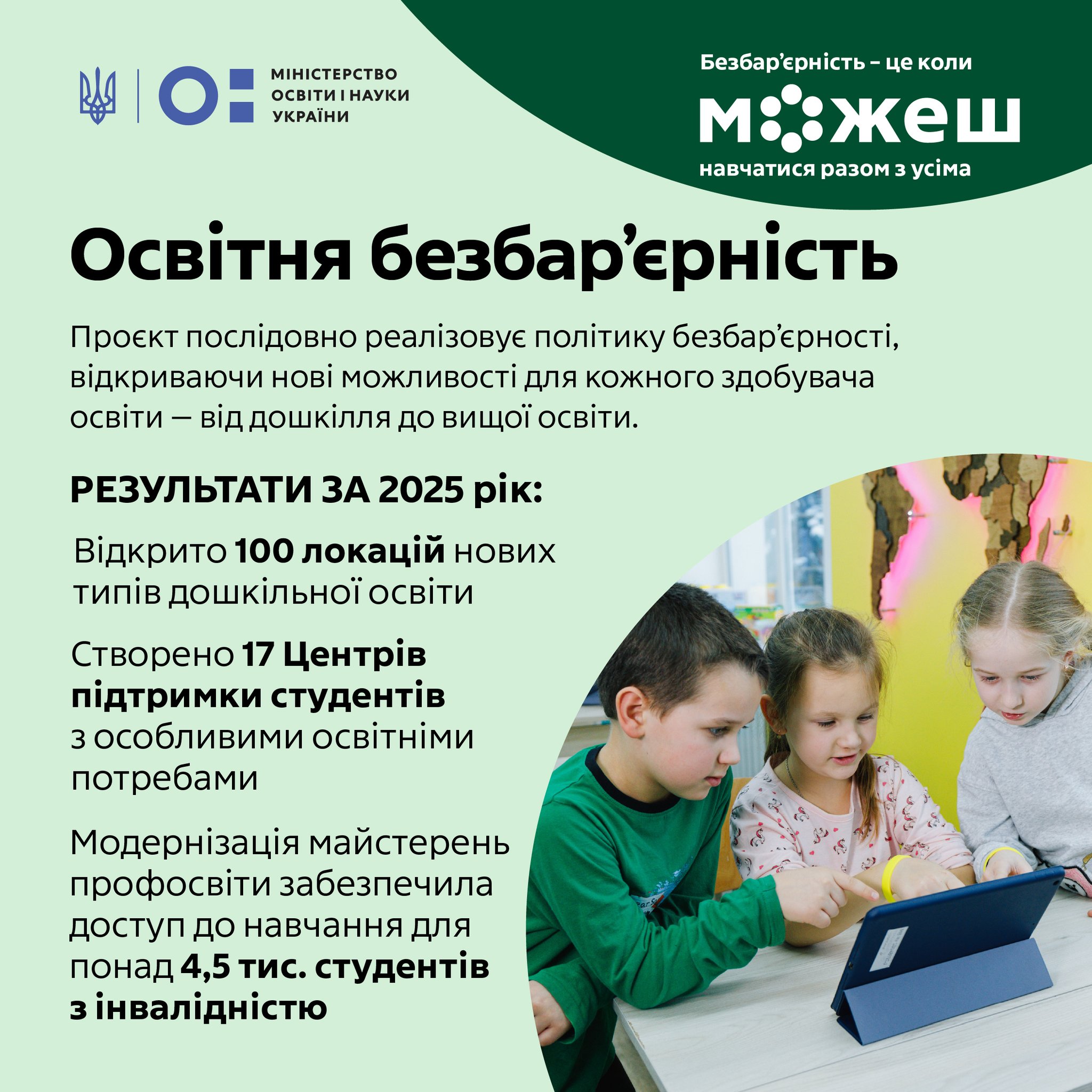 📍Освітню – забезпечують «Освітня безбар’єрність: відкриваючи нові горизонти», «Публічне управління без бар’єрів» (НАДС) та «Освіта для всіх» (Міносвіти). В межах останнього проєкту в інклюзивних класах навчаються 49 тис. 324 учні.