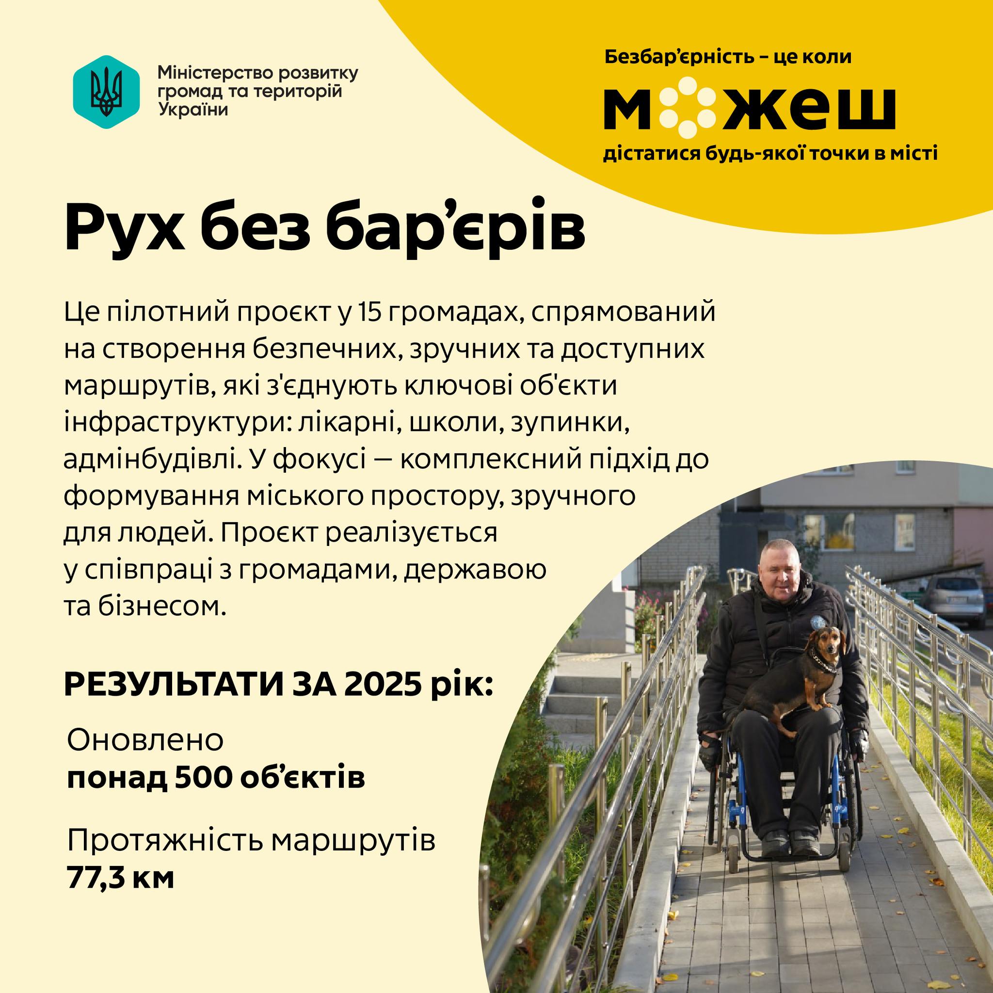 📍 Фізичну безбар’єрність створюють проєкти Міністерства розвитку громад та територій («Оновлення ДБН і європейські стандарти», «Безбар’єрне відновлення», «Рух без бар’єрів»). Протяжність безбар’єрних маршрутів у 15 пілотних містах сягає вже 77 км.