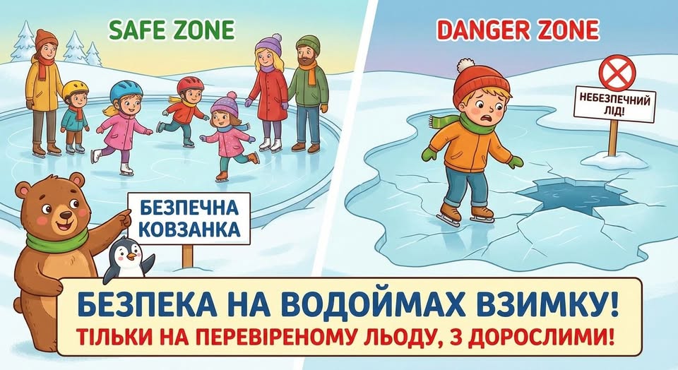 ✅ необхідно постійно пильнувати за дозвіллям дітей та пояснювати їм небезпеку тонкої криги