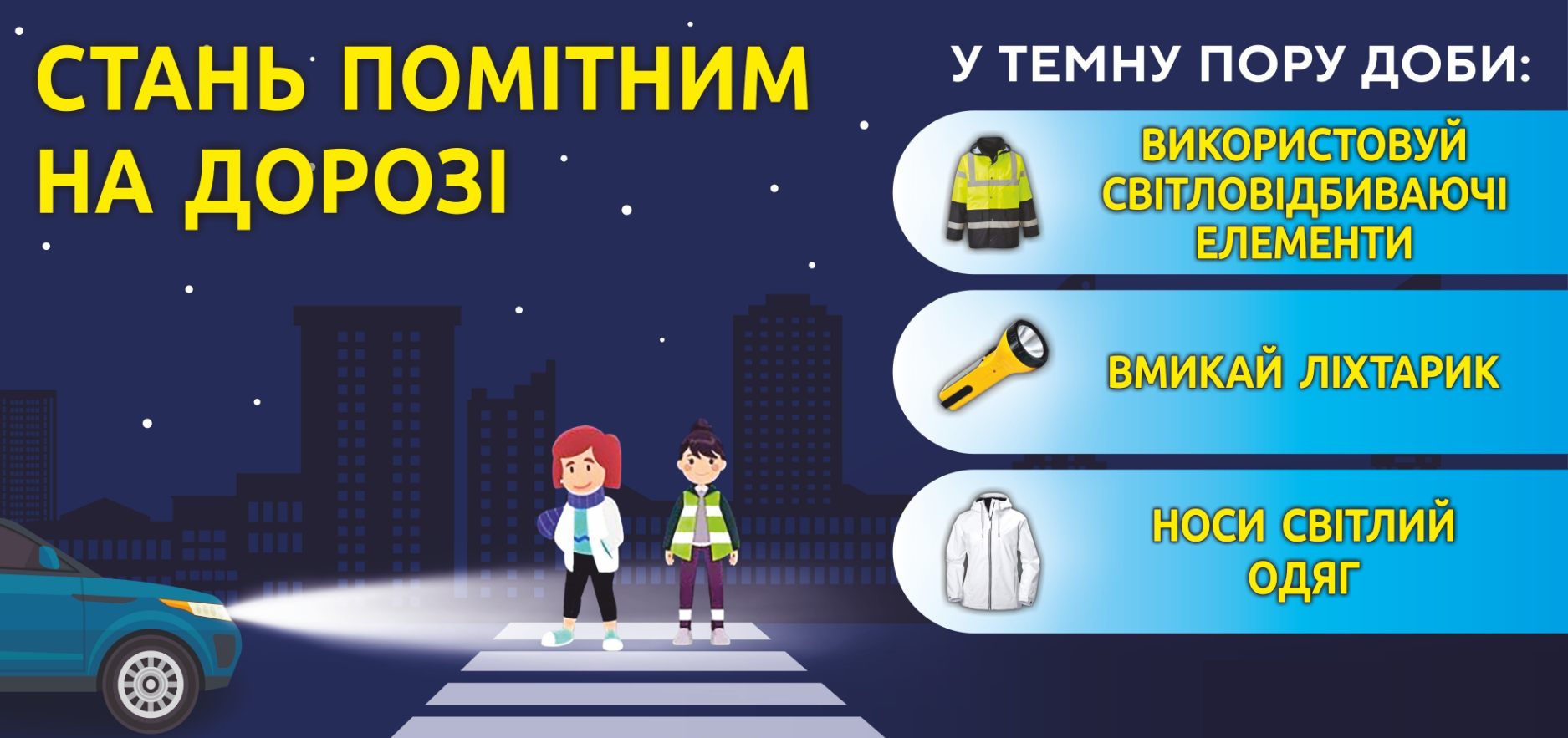 У зв’язку з вимкненнями електроенергії та раннім настанням темряви, у темний час доби значно зростає ризик дорожньо-транспортних пригод. Особливо вразливою категорією на вулицях стають пішоходи, зокрема діти, які самостійно повертаються додому зі школи чи гуртків.