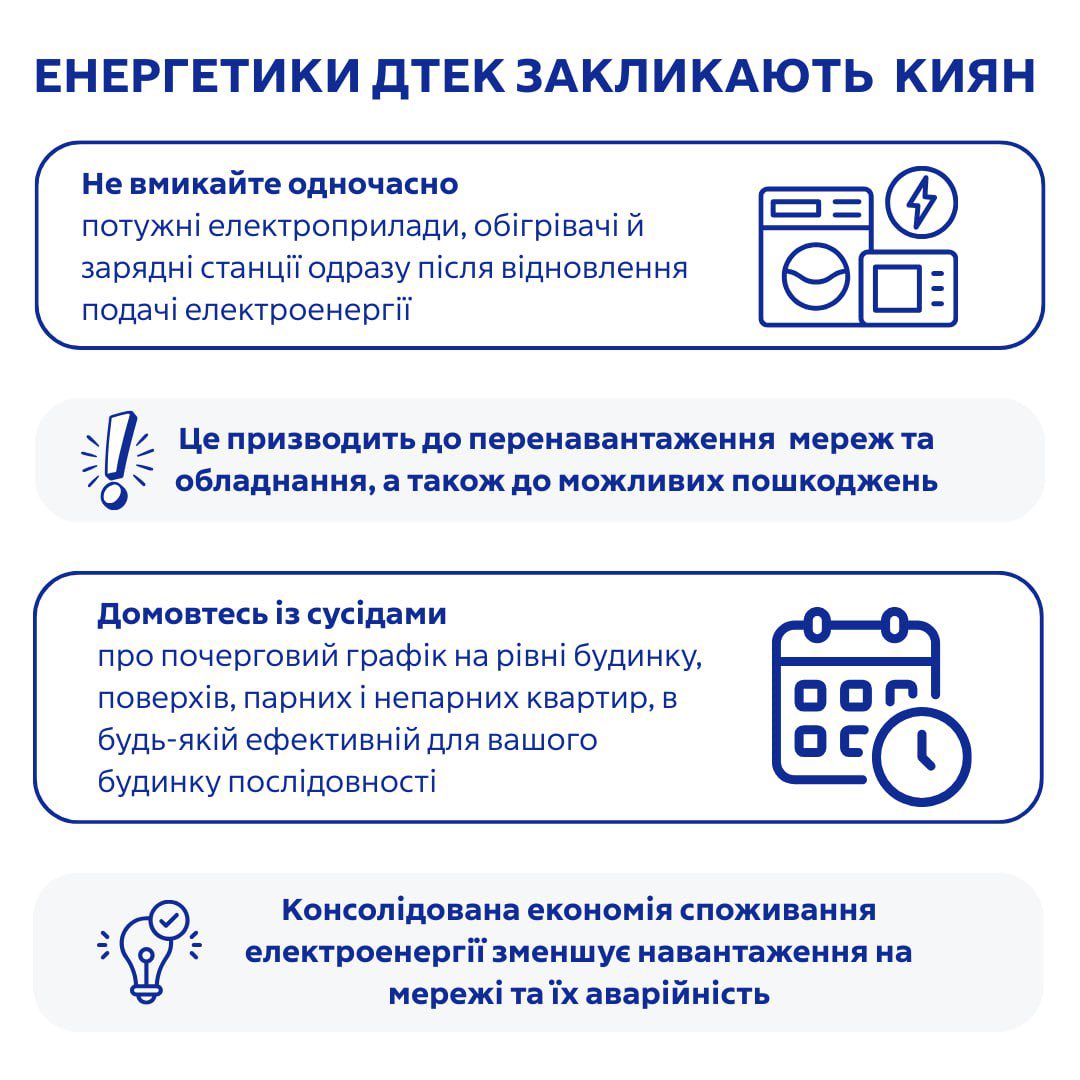 Енергетики нагадують: коли електроенергію відновлено, не варто одразу вмикати всі прилади. Навантажуйте мережу поступово – це допоможе уникнути перевантажень і нових аварій.