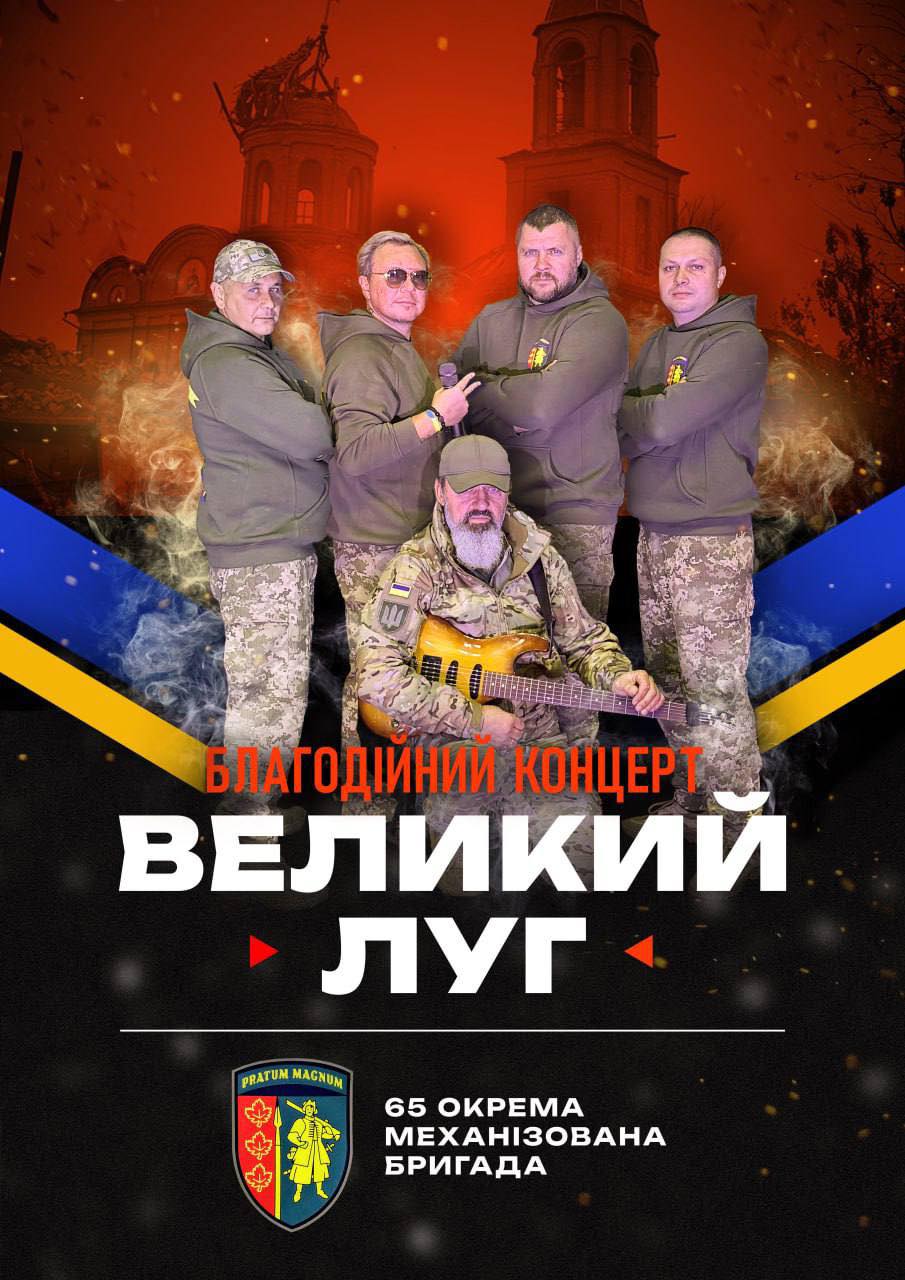 🎤 12:00 – Благодійний концерт гурту військових «Великий луг» 65-ї Окремої механізованої бригади Сухопутних військ Збройних Сил України