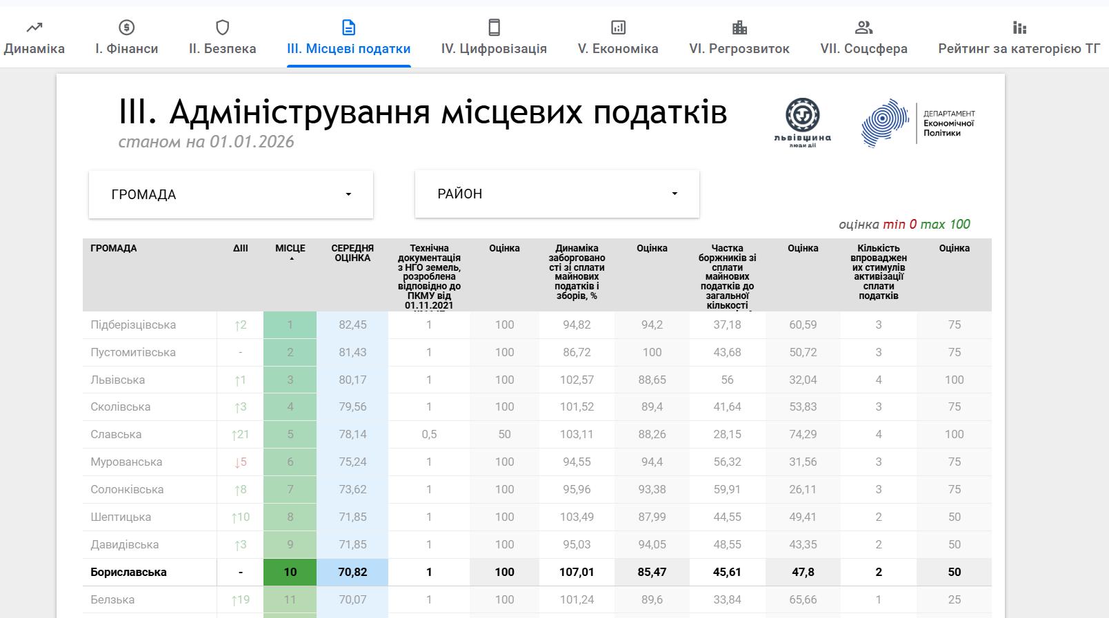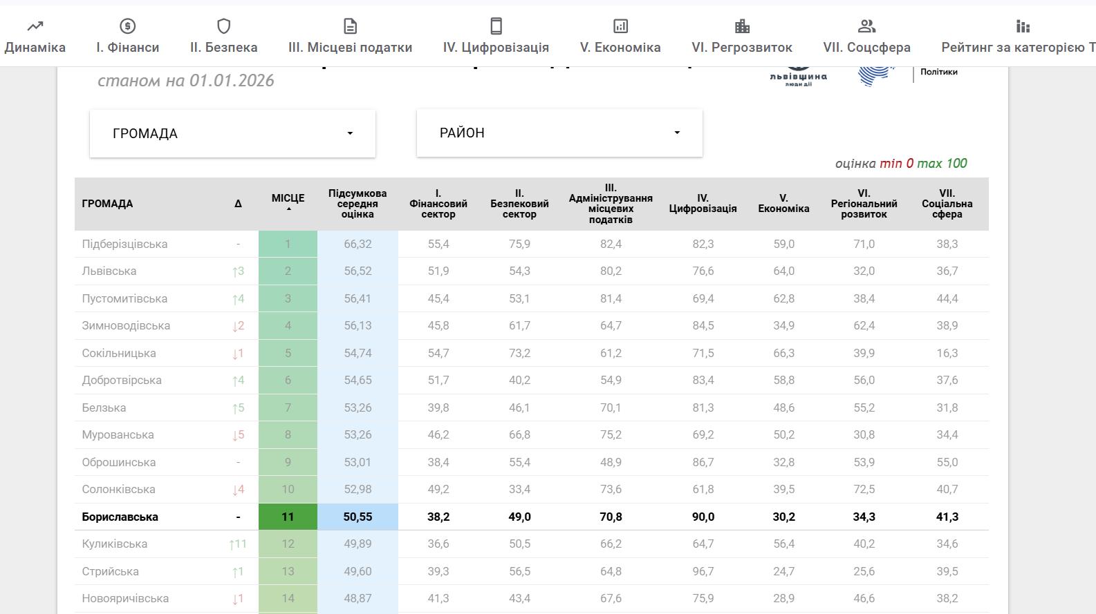 📊 Львівська обласна військова адміністрація оприлюднила комплексний рейтинг громад області станом на 1 січня 2026 року. За результатами моніторингу Бориславська міська територіальна громада у загальному рейтингу знаходиться на 11 місці місце серед 73 громад області, демонструючи високі показники в ключових сферах.