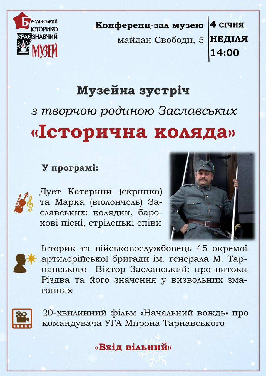 Бродівський історико-краєзнавчий музей запрошує на творчу зустріч з родиною Заславських, яка відбудеться у конференц-залі музею вже цієї неділі, 4 січня, о 14:00.