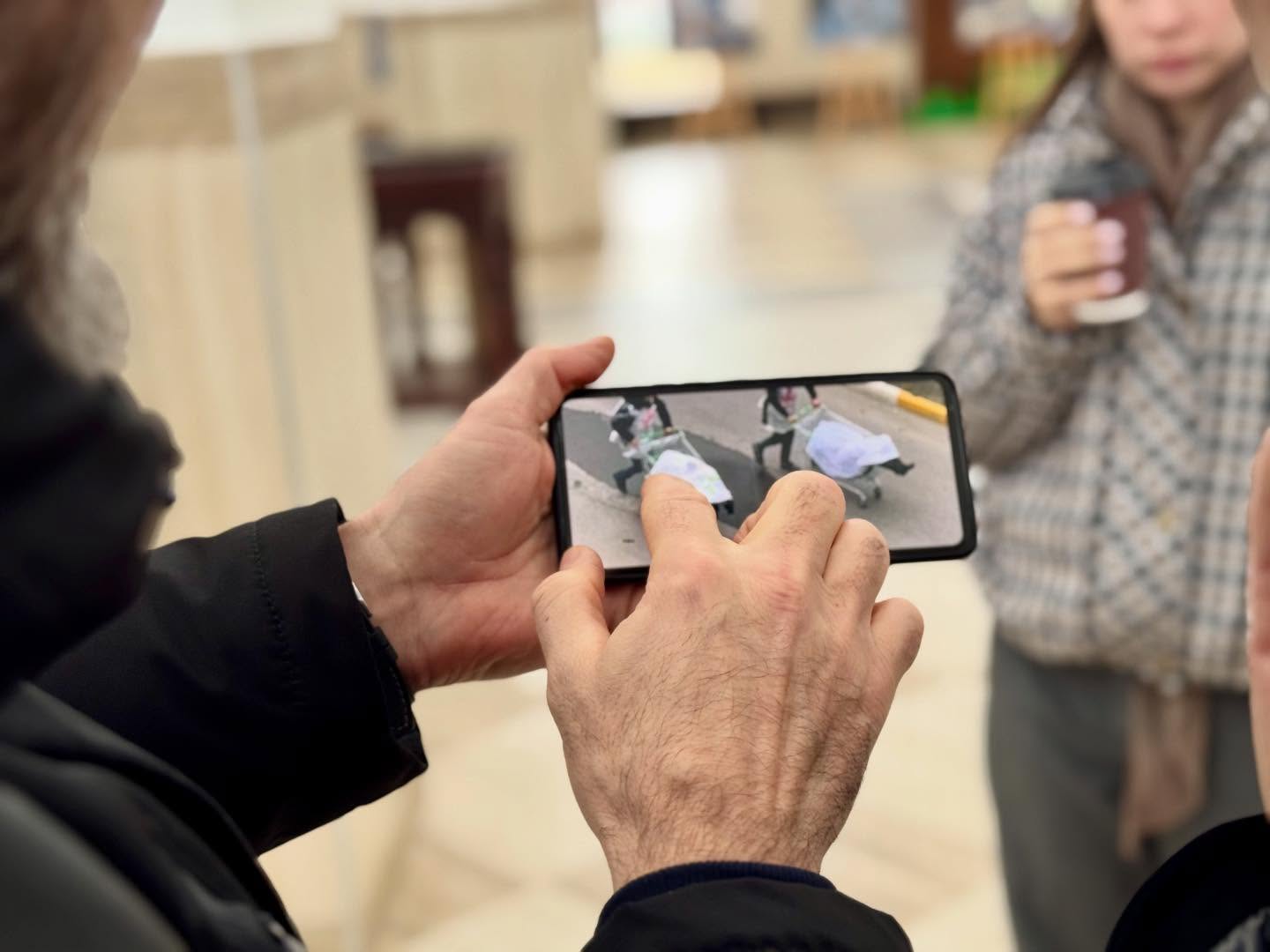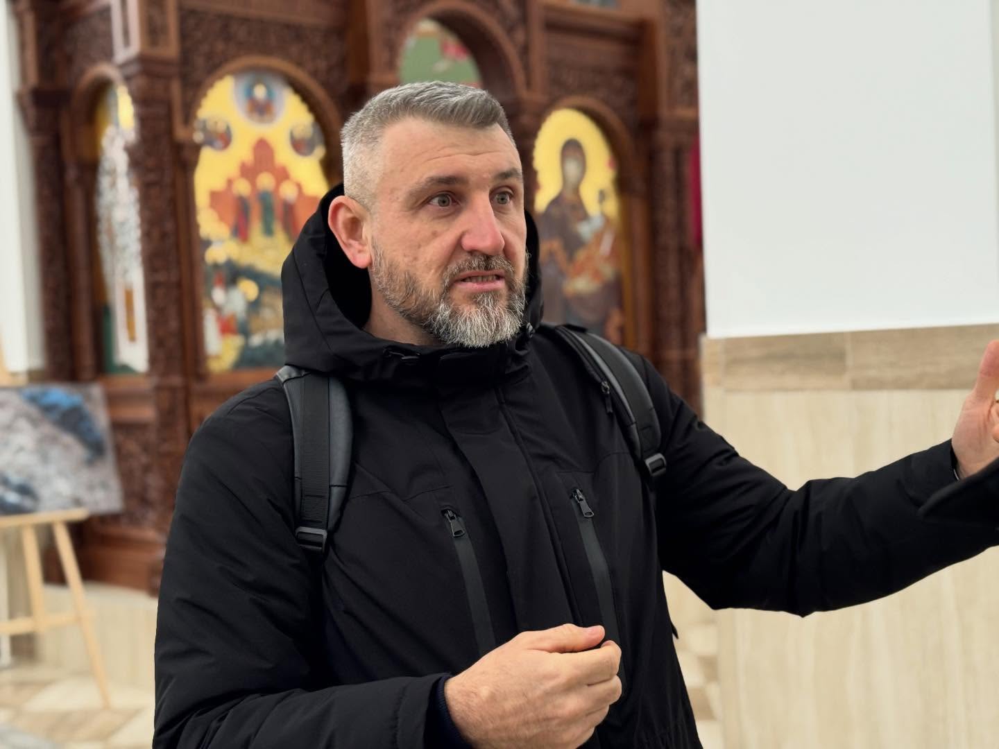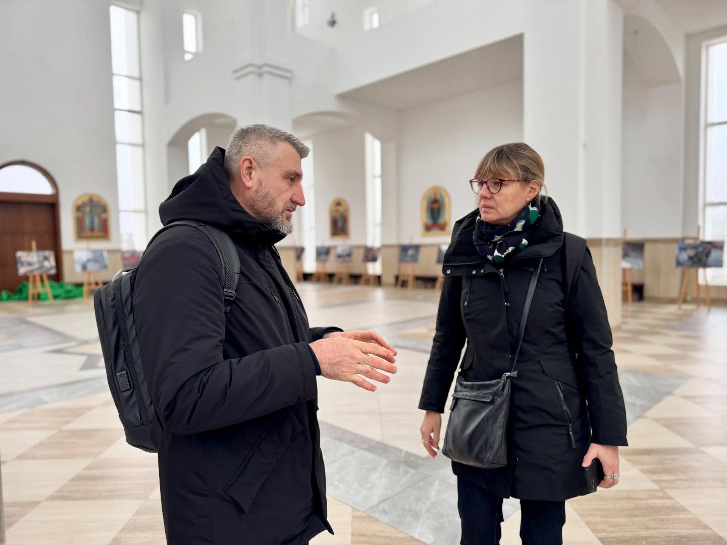 На території храму Святого Апостола Андрія Первозванного гостю зустрів керуючий справами Бучанської міської ради Дмитро Гапченко. Він розповів про злочини проти цивільного населення та наголосив на важливості фіксації свідчень безпосередньо на місці подій.