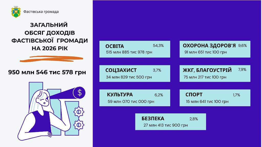 Загальний обсяг доходів Фастівської міської територіальної громади на 2026 рік визначено у сумі 950 546 578,00 гривень, у тому числі