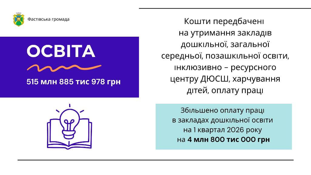 Кошти передбачені на утримання закладів дошкільної, загальної середньої, позашкільної освіти, інклюзивно – ресурсного центру ДЮСШ, харчування дітей, оплату праці, в тому числі збільшено оплата праці в закладах дошкільної освіти на 1 квартал 2026 року на 4 800 000 ,00 гривень.