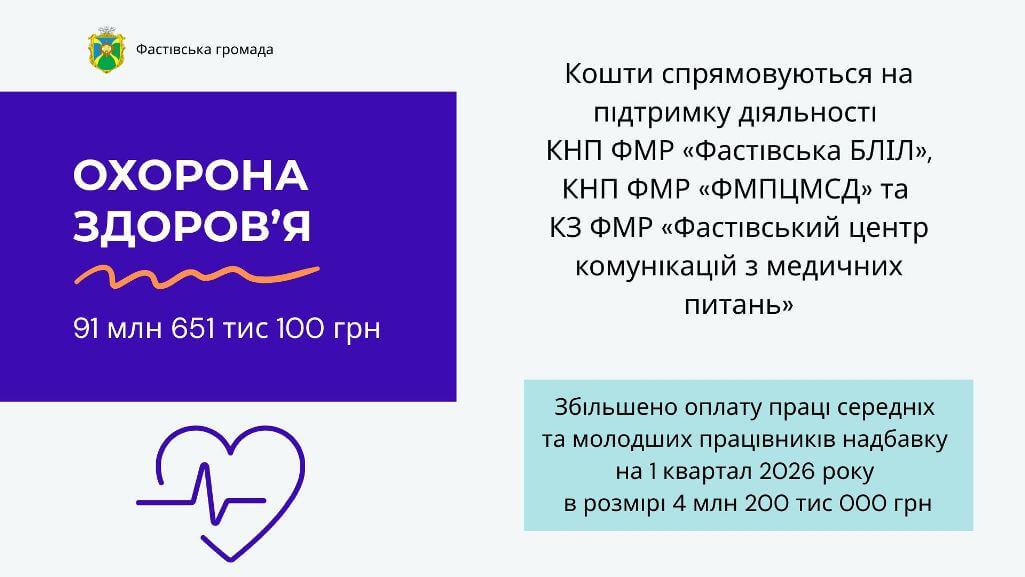 Кошти спрямовуються на підтримку діяльності КНП ФМР «Фастівська БЛІЛ», КНП ФМР «ФМПЦМСД» та КЗ ФМР «Фастівський центр комунікацій з медичних питань». Було прийнято рішення збільшити в оплаті праці середніх та молодших працівників надбавку на 1 квартал 2026 року в розмірі 4 200 000,00 гривень.