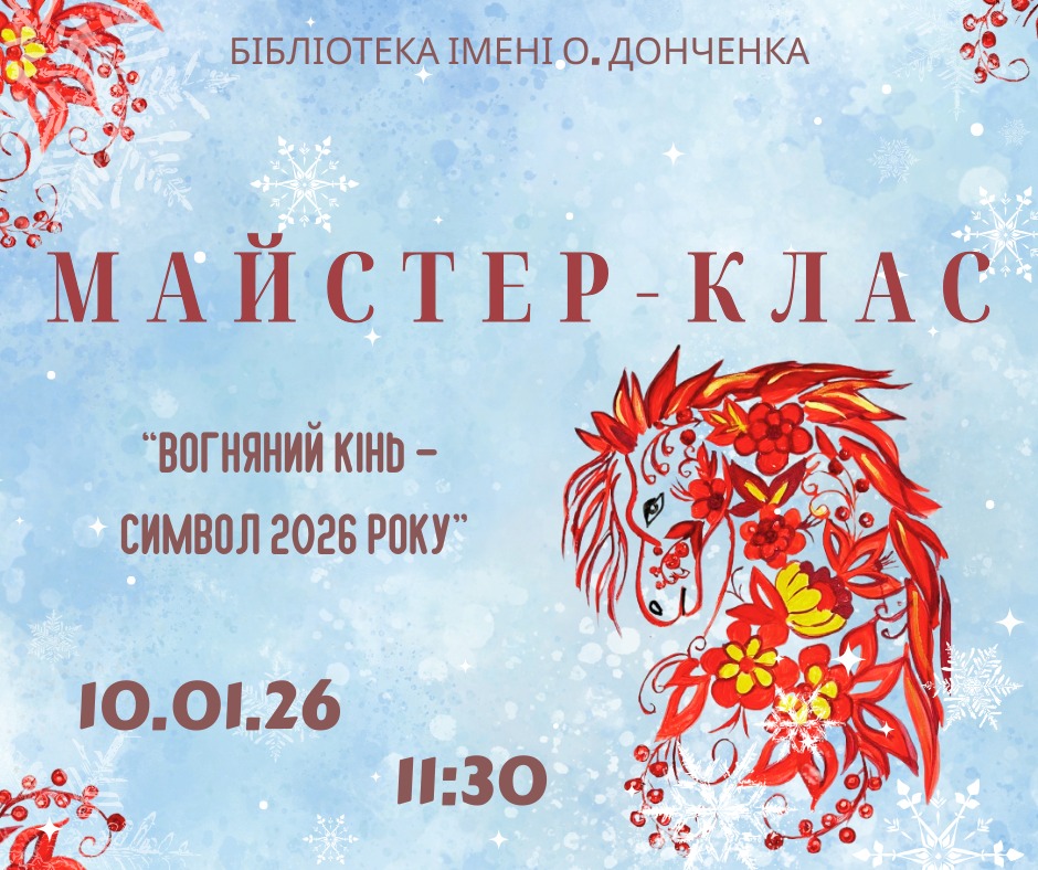 🤗 Бібліотека для дітей імені Олеся Донченка запрошує дітей разом з батьками на творчий майстер-клас “Вогняний кінь-символ 2026року” ✨❄️