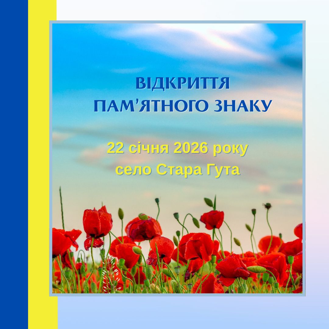 22 січня о 10:00 у Старогутянському старостинському окрузі відбудеться відкриття пам’ятного знаку на честь односельчан, які віддали життя за свободу та незалежність України.