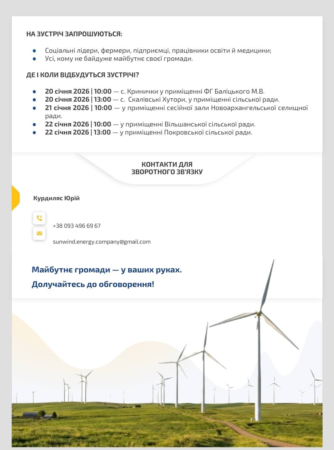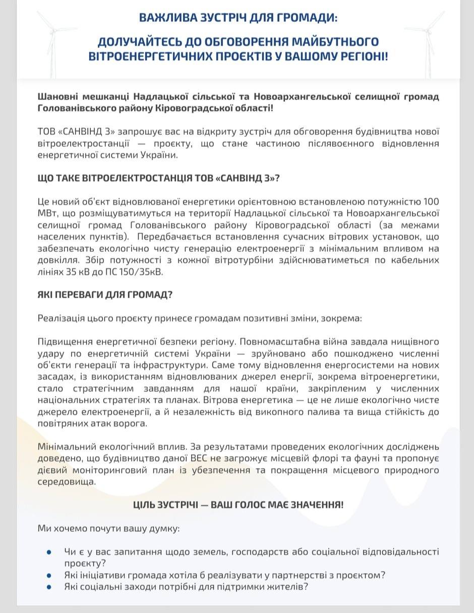 ТОВ «САНВІНД 3» запрошує вас на відкриту зустріч для обговорення будівництва нової вітроелектростанції — проєкту, що стане частиною післявоєнного відновлення енергетичної системи України.