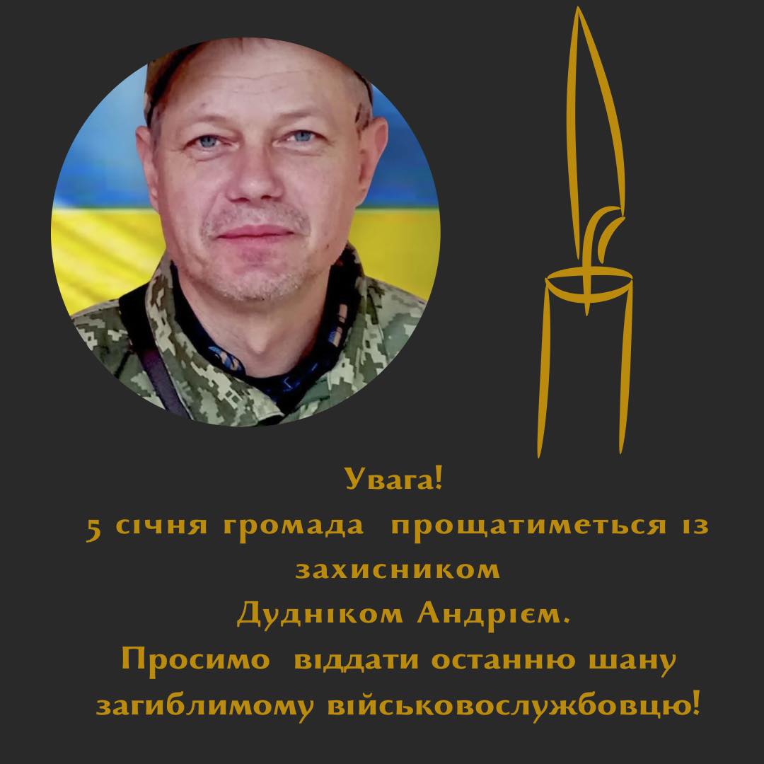 5 січня 2026 року Ямпільщина прощатиметься із загиблим захисником Дудніком Андрієм Валерійовичем з Ямполя.