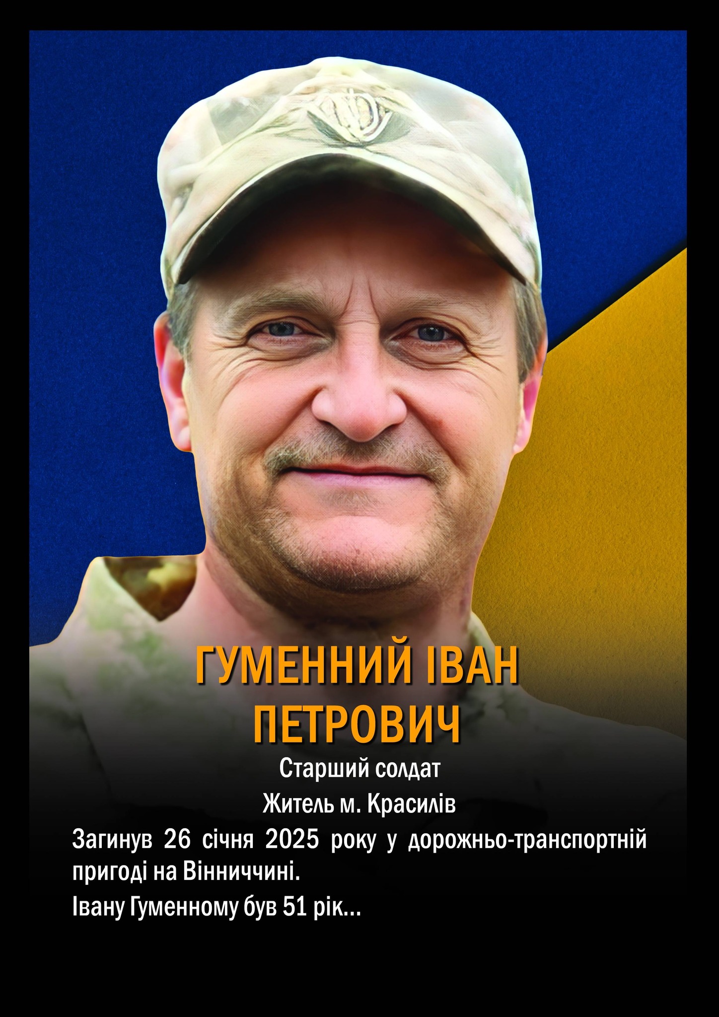 Сьогодні, 26 січня, минає перша річниця з дня загибелі нашого краянина, мужнього Воїна, який до останнього подиху боронив Україну – старшого солдата Івана ГУМЕННОГО.