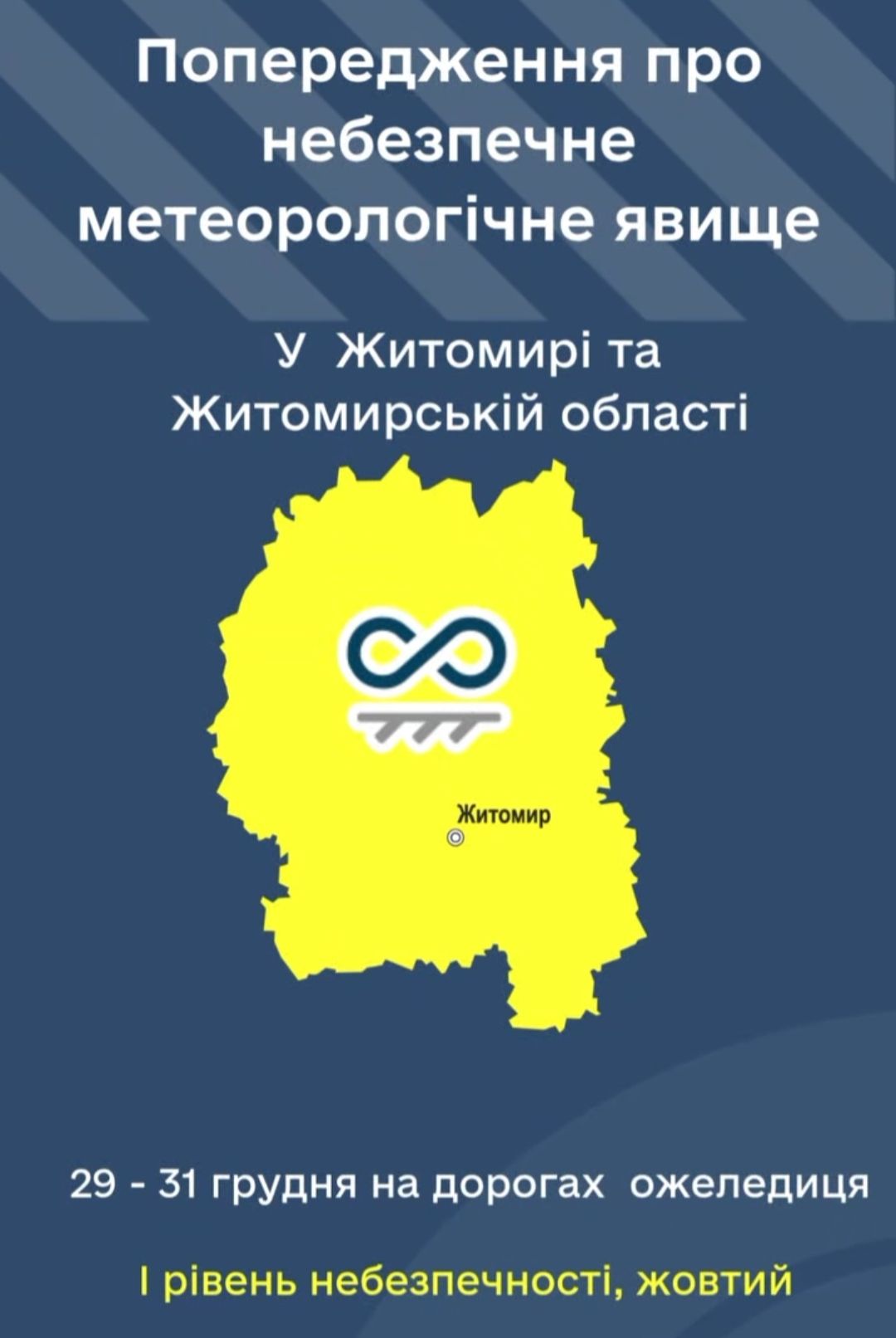 ‼️29 – 31 грудня на автошляхах Житомирської області очікується ожеледиця (І рівень небезпечності – жовтий🟡).