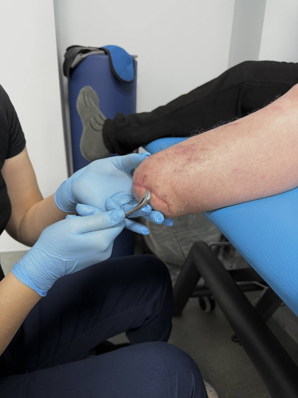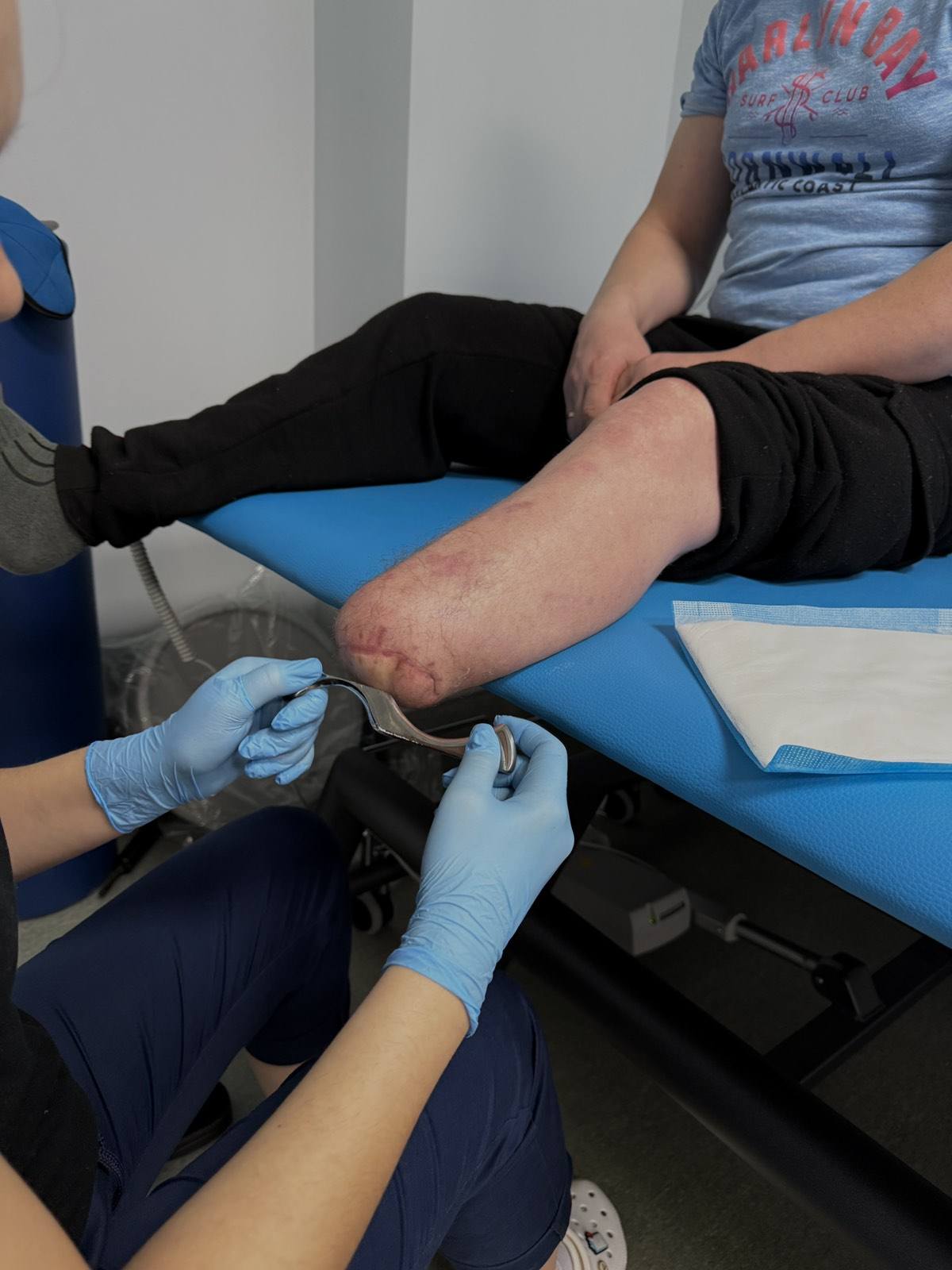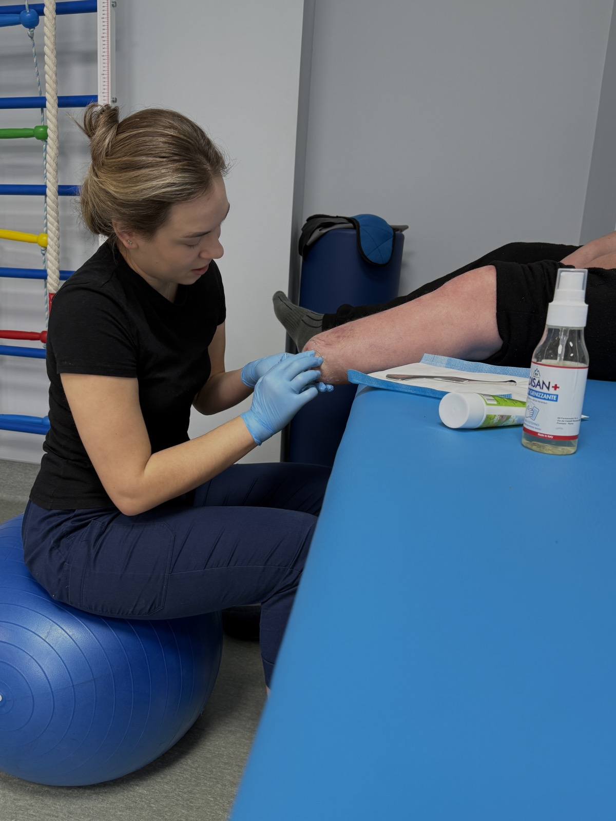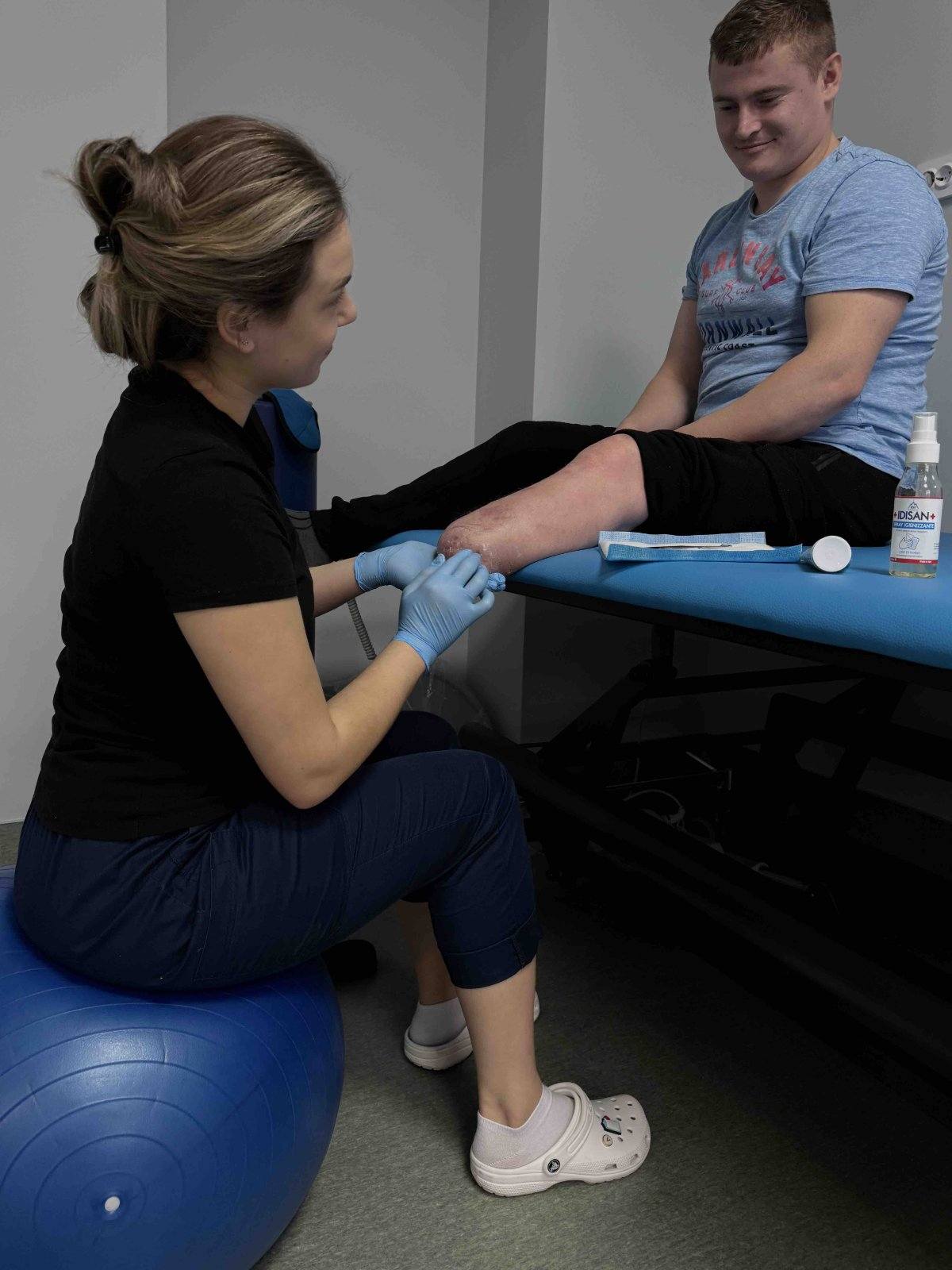 Фізичний терапевт Вікторія спеціалізується на роботі з пацієнтами після тяжких травм — з ампутаційними куксами, рубцевими змінами та наслідками вибухових чи вогнепальних ушкоджень. У своїй практиці вона поєднує сучасні техніки: роботу блейдами, стабілізаційні та адаптаційні методи, що покращують контроль руху та формування правильних рухових патернів.