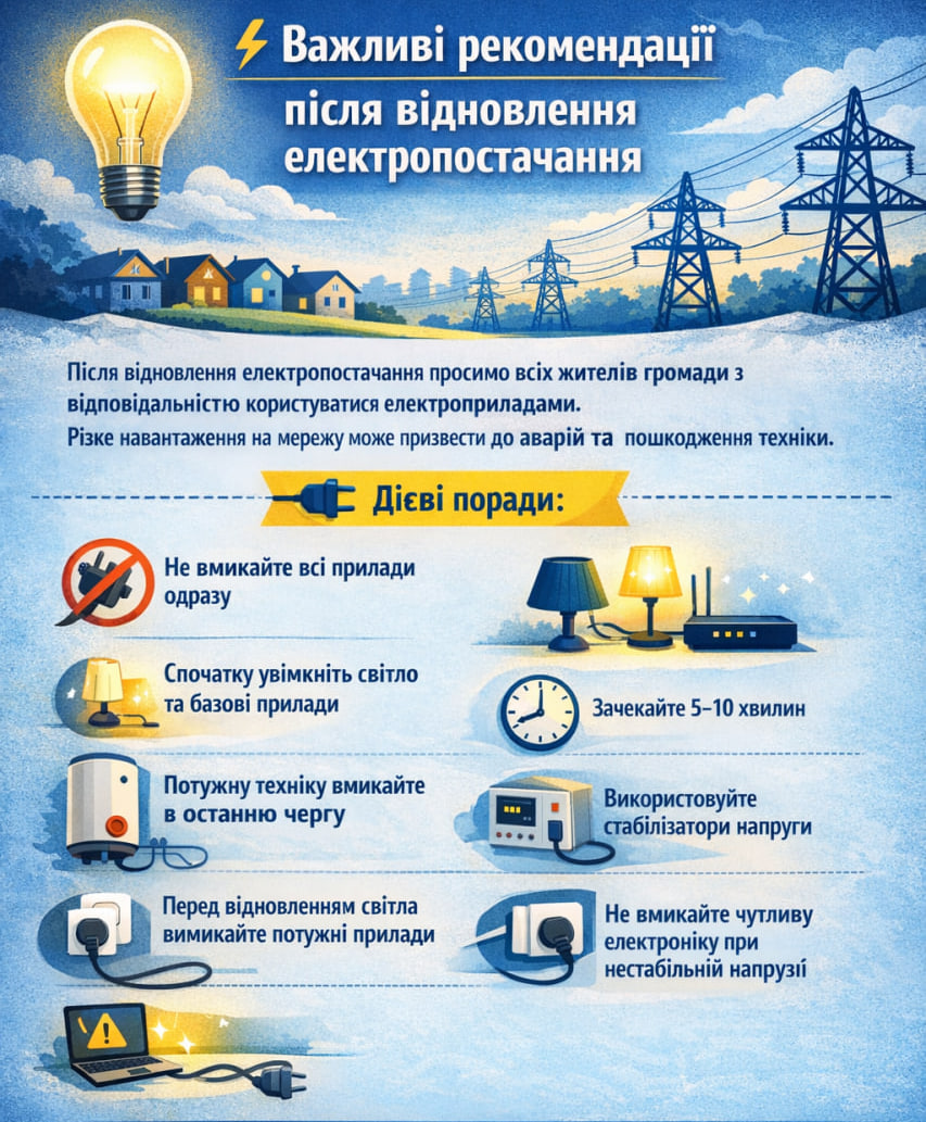 Після відновлення електропостачання просимо всіх жителів громади з розумінням та відповідальністю поставитися до користування електроприладами. У перші хвилини після появи світла електромережа є особливо вразливою до перевантажень.