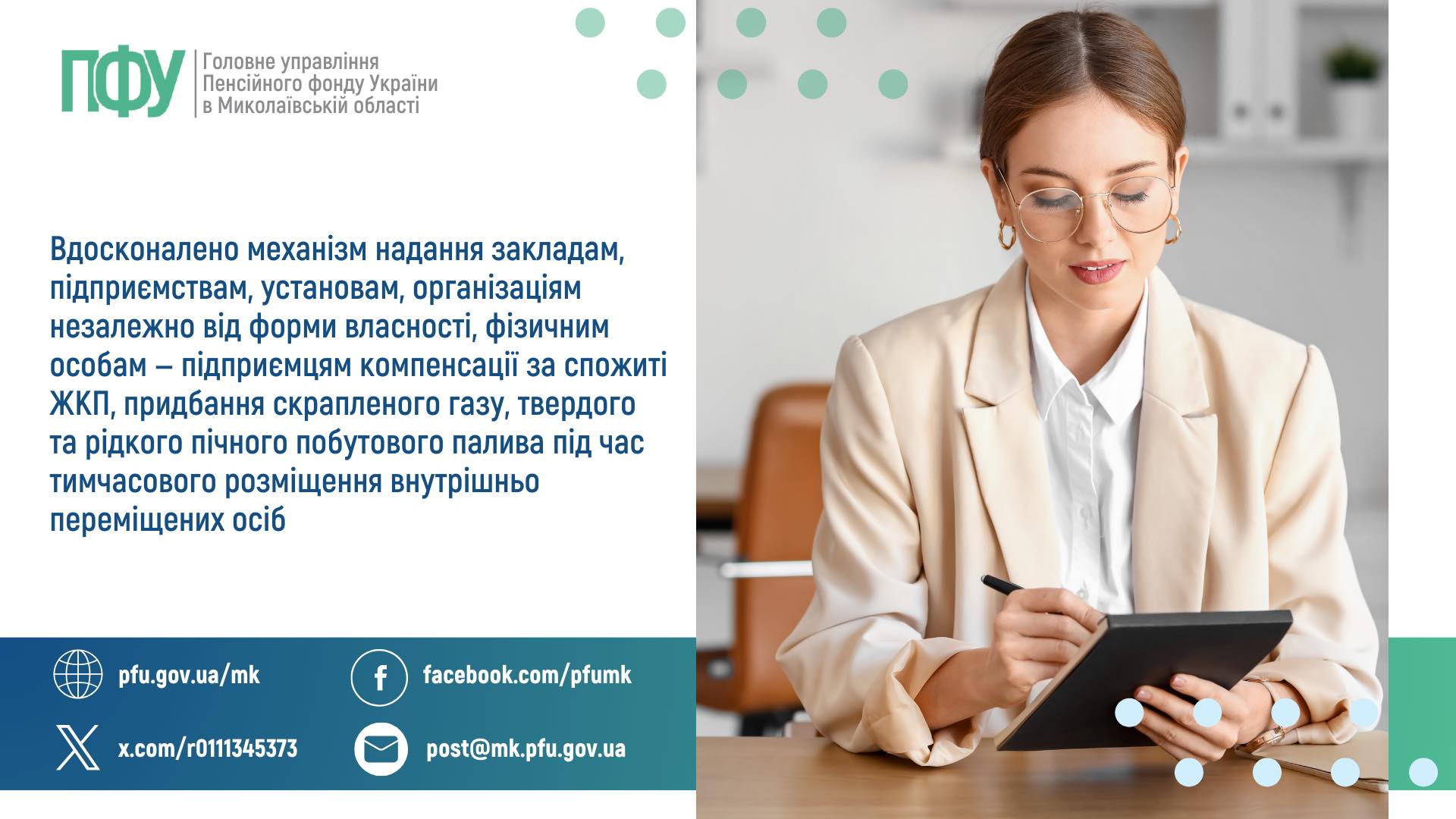 – у разі розміщення внутрішньо переміщених осіб, строк проживання яких не перевищує 30 днів, запроваджено подання щомісяця до 20 числа заяви про отримання компенсації за спожиті ЖКП, придбання скрапленого газу, твердого та рідкого пічного побутового палива під час безоплатного розміщення внутрішньо переміщених осіб (далі — Заява) в електронній формі через вебпортал електронних послуг Пенсійного фонду України;