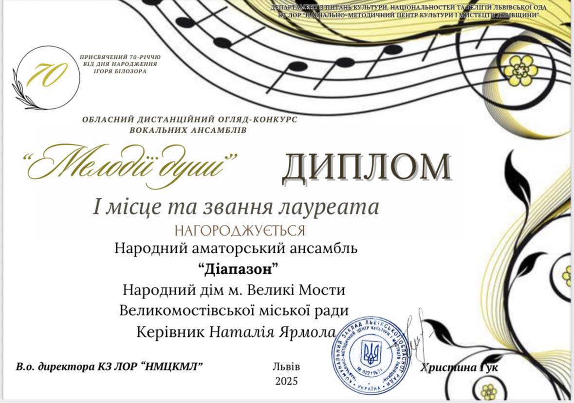 Великомостівська міська рада щиро вітає народний аматорський ансамбль «Діапазон» Народного дому м. Великі Мости з блискучою перемогою — І місцем та здобуттям звання лауреата в обласному дистанційному огляді-конкурсі вокальних ансамблів «Мелодія душі», присвяченому 70-річчю від дня народження Ігоря Білозіра!