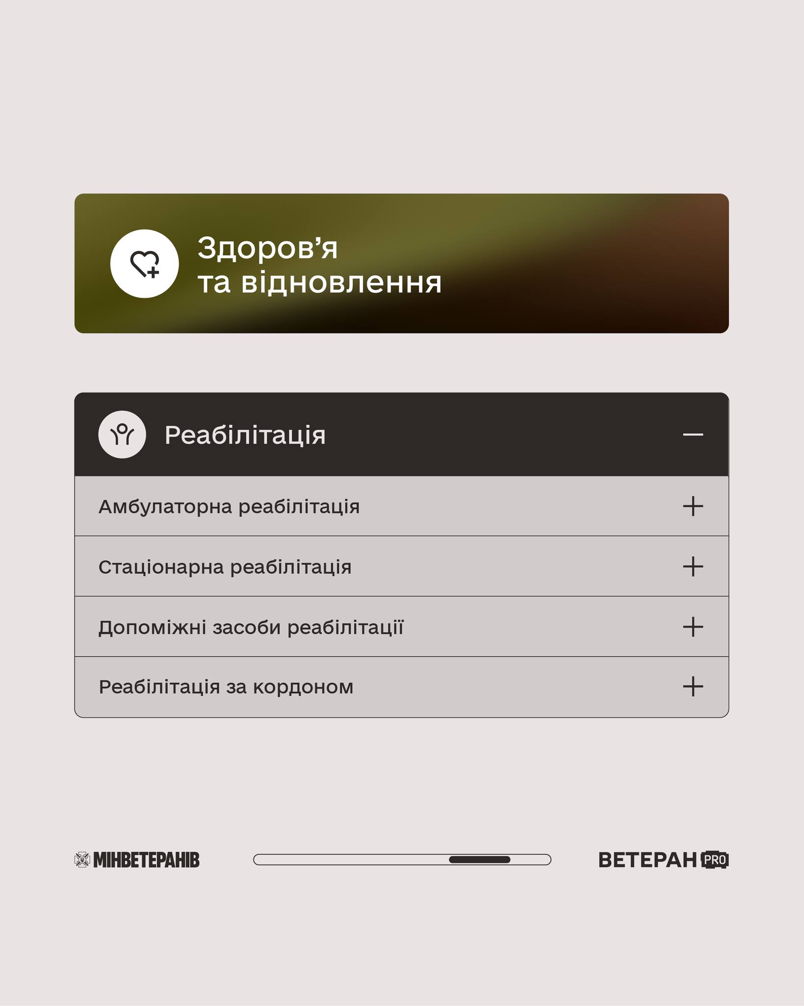 🔹 Реабілітація — амбулаторна й стаціонарна, допоміжні засоби реабілітації, а також можливість реабілітації за кордоном.