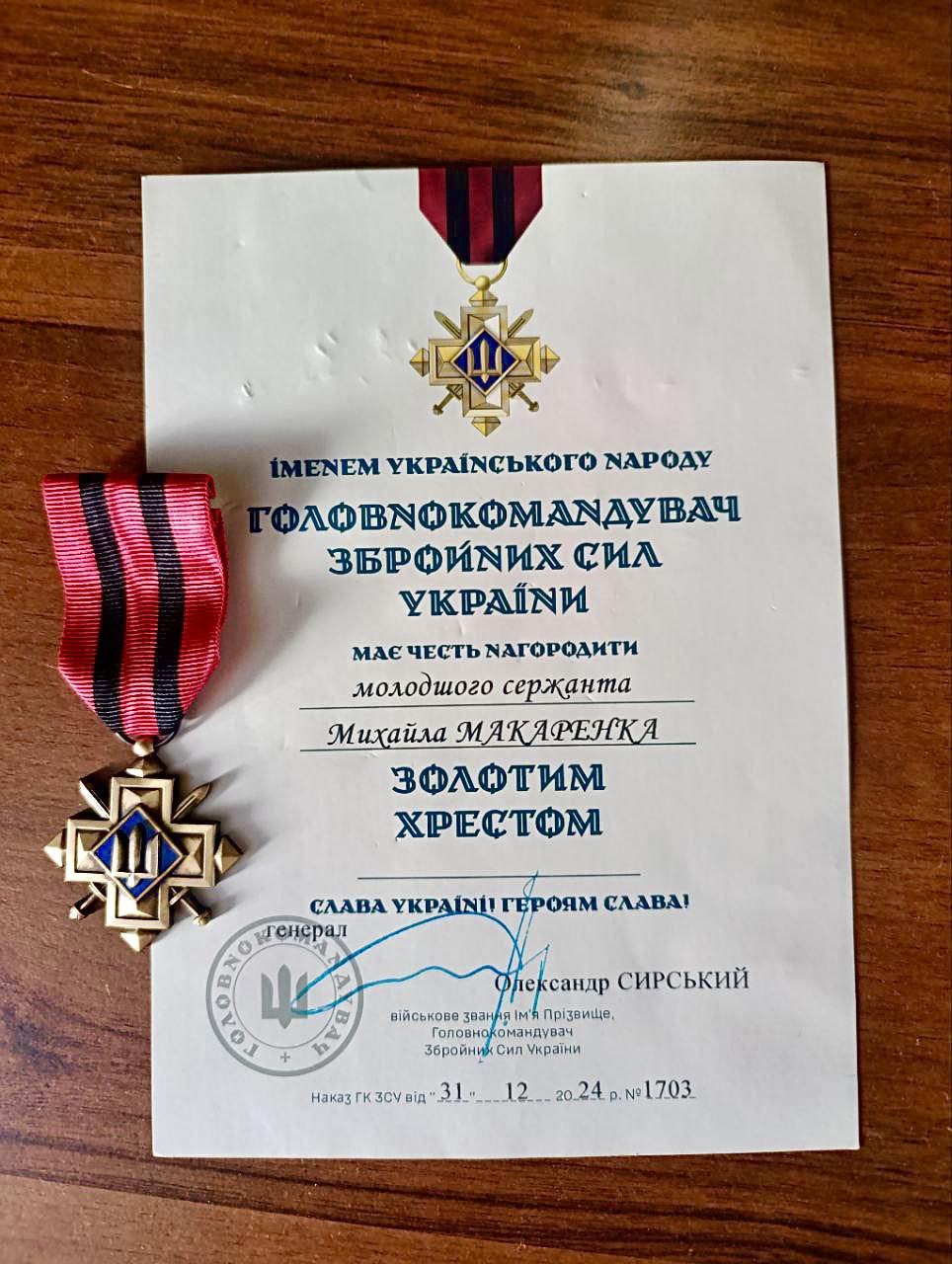 З великою гордістю повідомляємо, що наш земляк, житель с. Любечанинів, молодший сержант Михайло Макаренко нагороджений Золотим Хрестом — почесною відзнакою Головнокомандувача Збройних Сил України.