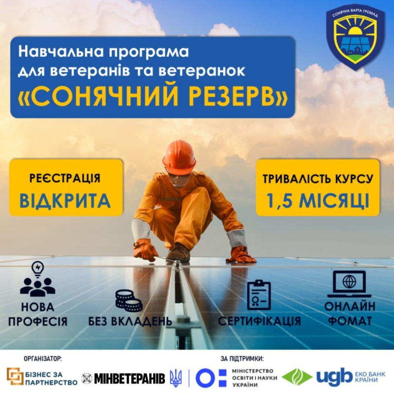 Запрошуємо долучитися до освітньої програми «Сонячний резерв» — безкоштовної короткострокової онлайн-програми для ветеранів, ветеранoк та членів їхніх родин.
