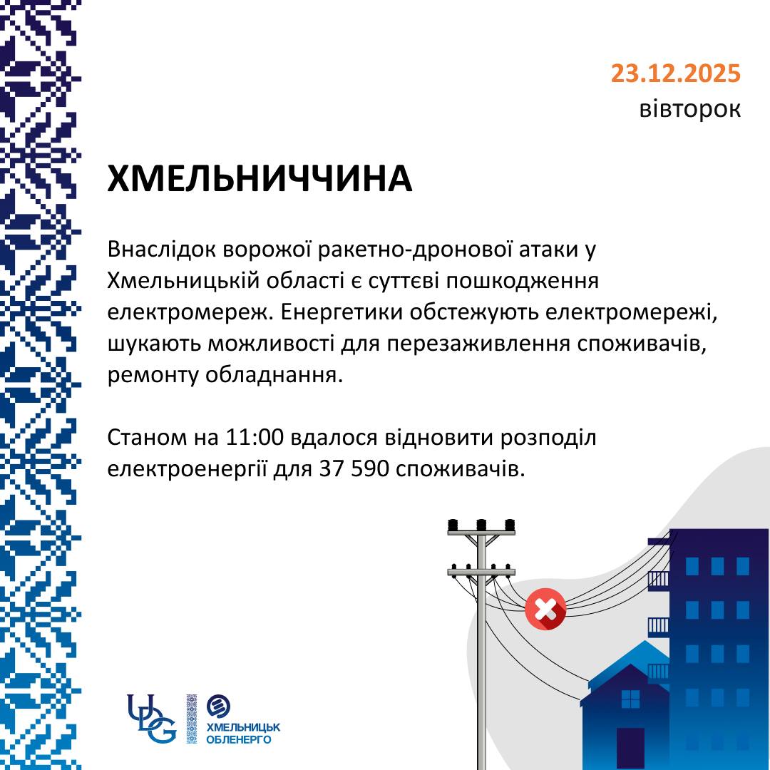 ❗Внаслідок сьогоднішньої ворожої ракетно-дронової атаки у Хмельницькій області є суттєві пошкодження електромереж. Електрична енергія відсутня у більшості споживачів. Енергетики обстежують електромережі, стан обладнання, шукають можливості для перезаживлення споживачів та ремонту обладнання.