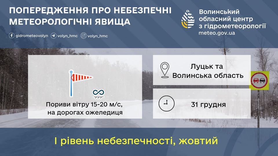 За даними Волинського обласного центру з гідрометеорології 31 грудня в області очікується хмарна погода. Можливий невеликий сніг, подекуди хуртовина. Вітер північно-західний, 7-12 м/с, пориви 15-20 м/с. Температура вночі 3-8° морозу, вдень 1-6° морозу.