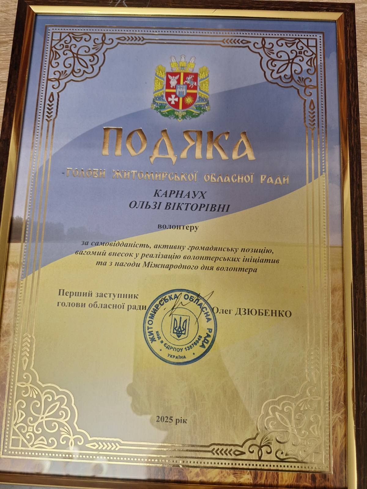 Подякою Житомирської обласної ради нагороджено нашу невтомну бджілку, людину з великої літери – приватного підприємця Ольгу Карнаух.